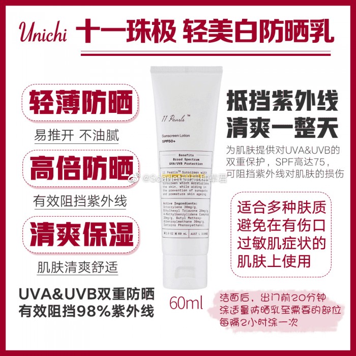 国内现货到啦~【Unichi十一珠极轻美白防晒乳SPF50+防晒霜60毫升】 为一款轻薄、滋润的防晒乳霜。含有SPF50+的防晒指数可保护肌肤免受UVA和UVB的伤害,避免肌肤因日晒出现干燥、细纹等问题。其富含的芦荟和维生素E,可以延缓皮肤衰老;帮助肌肤抵御环境污染、辐射、紫外线损害,让皮肤无负担的防护,并显现健康光彩。澳洲TGA认证!全世界最高标准的监管机制!不允许含有任何对人体健康有隐患的原料!其对于防晒成分的要求亦是全球最严!!!