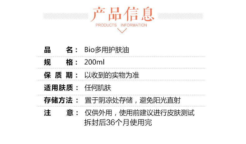 不仅仅能防妊娠纹!Bio oil百洛油以油护肤,开启美肌修护之旅!一油多用,轻松解决多种肌肤问题!让准妈妈抛弃妊娠皮肤烦恼!内含多种植物精华:金盏花、迷迭香、洋甘菊、薰衣草。有效促进皮肤愈合抚平疤痕,镇定舒缓、改善肤色。不仅可以改善妊娠纹还可以滋润皮肤,秋冬护理少不了!