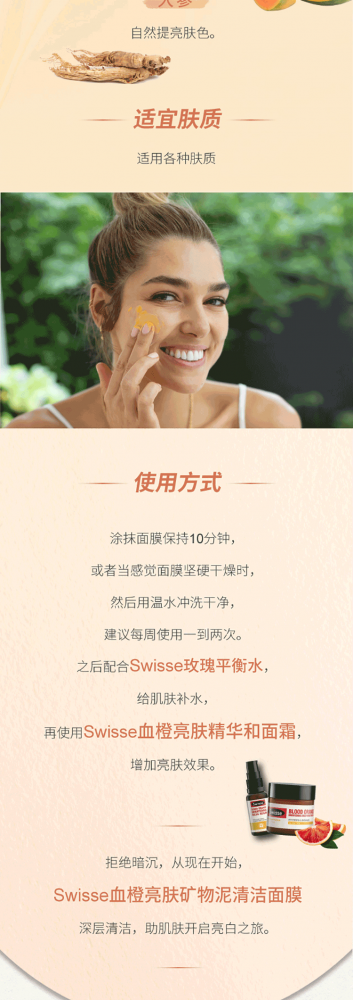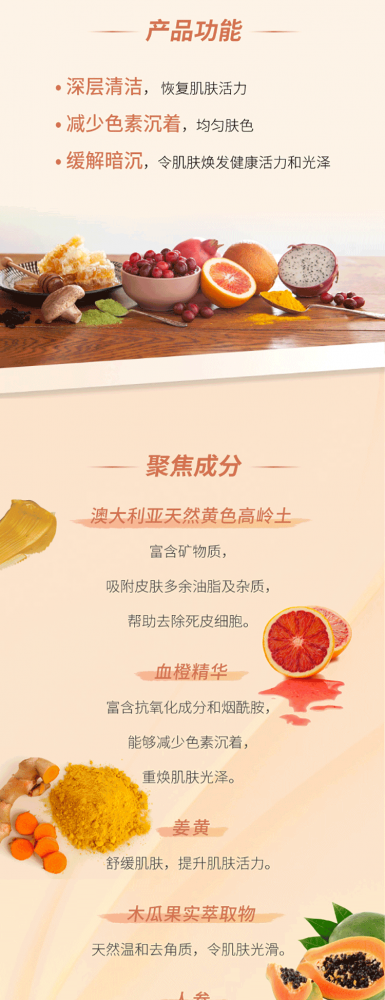 含有血橙精华、烟酰胺、人参提取物、玫瑰油和澳洲黄粘土等多种天然成分