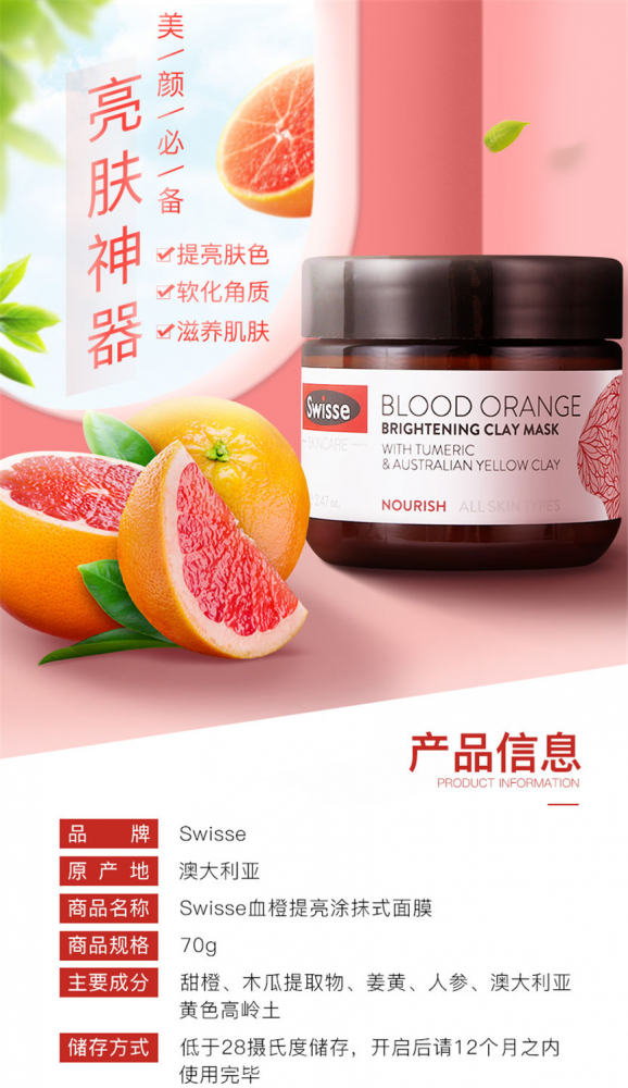 (国内现货)(活动价)Swisse面膜/血橙亮肤矿物泥清洁面膜/血橙面膜70克