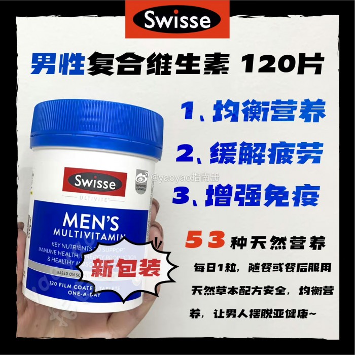 Swisse专为男士研制打造的综合性营养维生素片!补充53种营养元素,内含25种天然草本及提取物,天然植物萃取,全面提供男性每日必须的维生素、矿物质及草本精华,还一并注入抗氧化抗衰老配方,有效缓解疲劳,舒缓压力,改善生理机能,保持生活工作的最佳状态! 一天一粒,一瓶可使用长达4个月,适合12 - 50岁人群,健康常在!