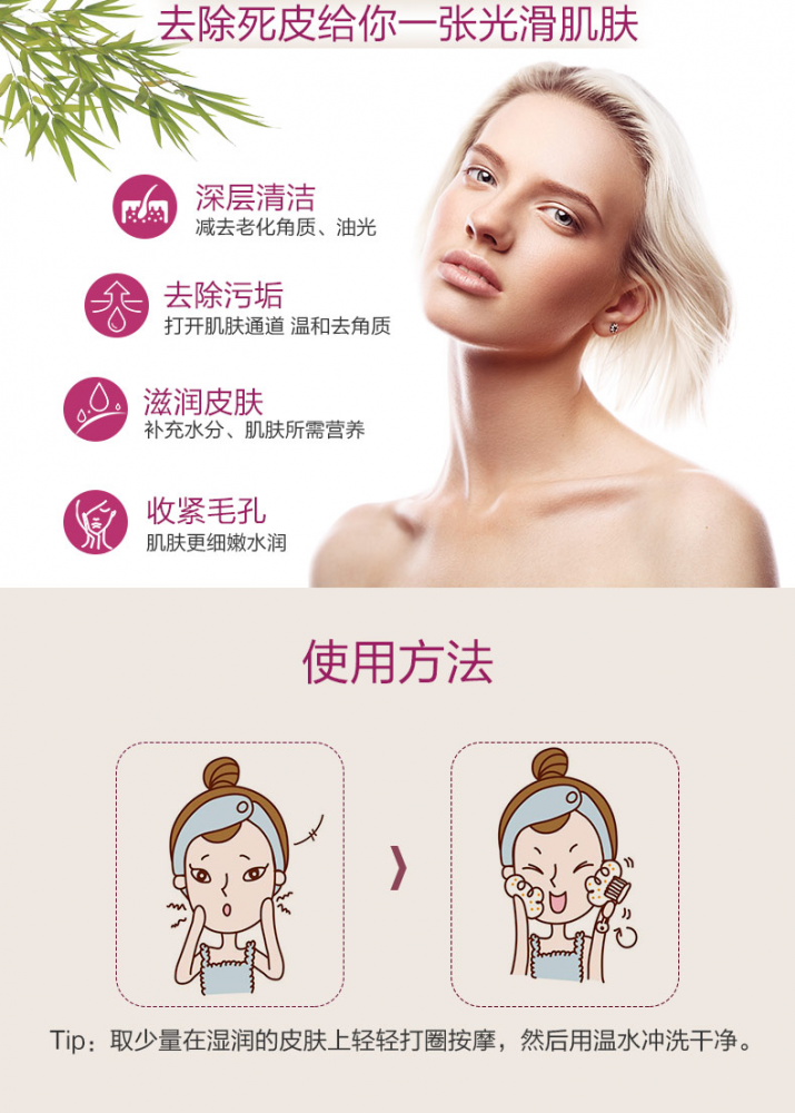 巨好用的磨砂膏!面部去死皮,收缩毛孔,天然去角质!富含微竹颗粒和柑橘果酸,有利于温和的清洁肌肤!适合所有肤质!湿面后,降少量磨砂膏涂于手上,轻轻按摩面部,清水洗净即可,就是这么简单!