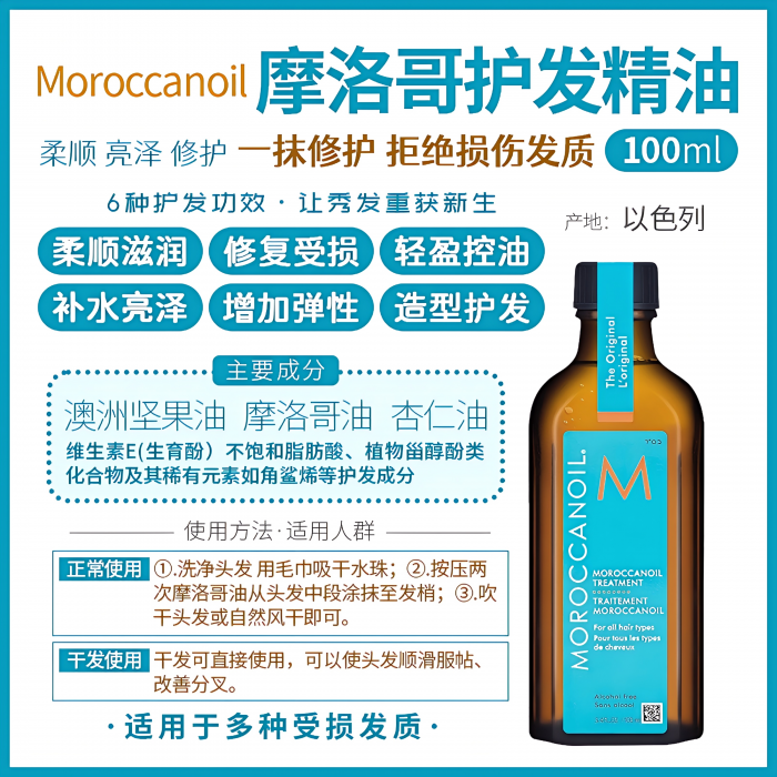 MOROCCANOIL摩洛哥护发精油100ml以色列坚果油阿甘油修复毛躁烫染。 女人我最大节目最强推荐,十项全能的Moroccanoil 摩洛哥护发精油用途无所不包,滋养又零残留的配方成份,是基础护发、造型与最后定发妆的好帮手。发界模范生Moroccanoil 摩洛哥护发精油能与任何产品混搭,完美出击,甚至还能缩短吹干时间,并在各个步骤中,把握每次机会改善发质。