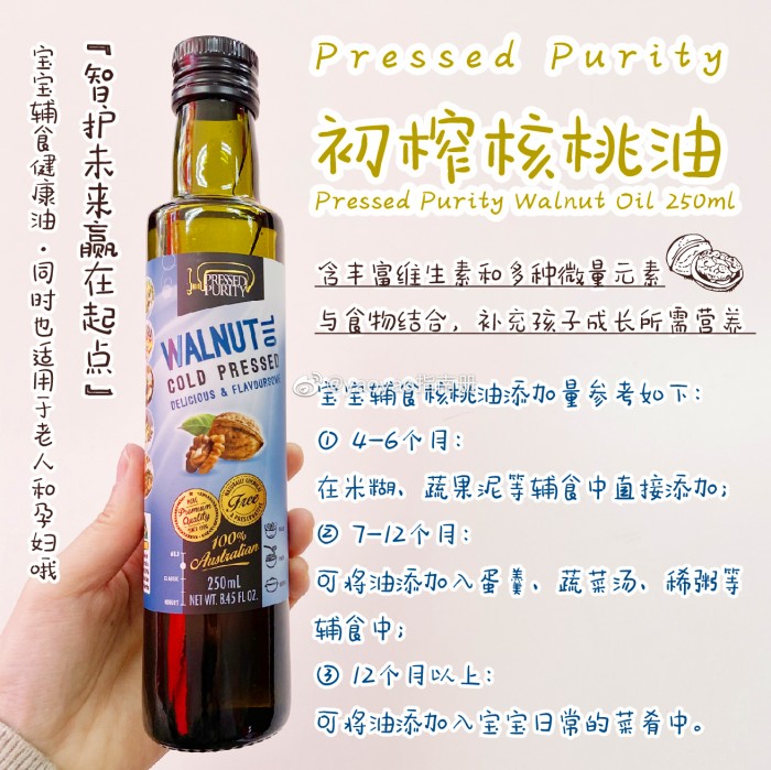 🇦🇺强烈推荐下澳洲Pressed Purity核桃油(之前很多人问都没找到合适的产品,其实澳洲最常见的超市就有卖,100%澳产),生产采用的是冷榨技术,完美的保留了核桃的全营养,富含不饱和脂肪酸,包含:亚麻(Omega3)、亚油酸(Omega6)和Omega9,适合人群:婴幼儿、儿童、孕产妇、老人等哦。