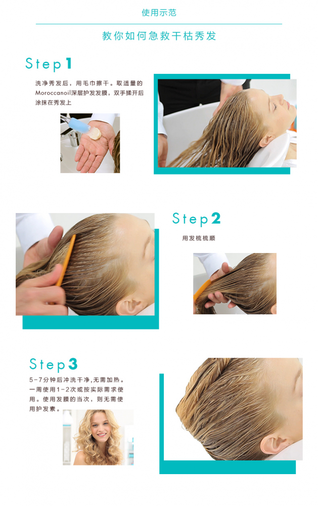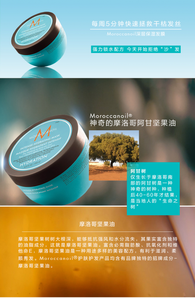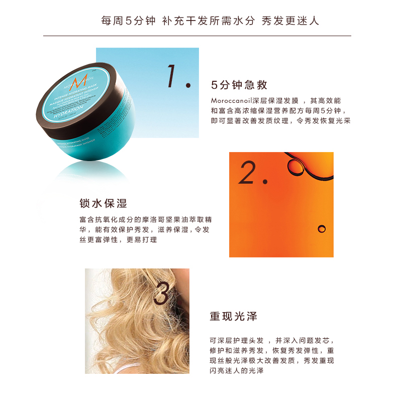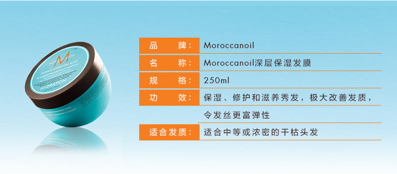 暗哑无光、毛糙打结、干枯分叉、受损易断??5分钟急救!深层滋养不同问题的秀发!!!摩洛哥深层保湿发膜富含高效浓缩营养配方,每周5分钟即可显著改善发质纹理,令秀发焕发光彩!搭配同品牌护法精油效果更佳!!!