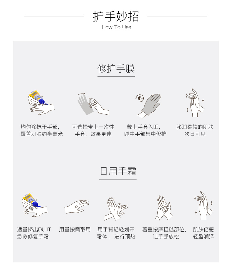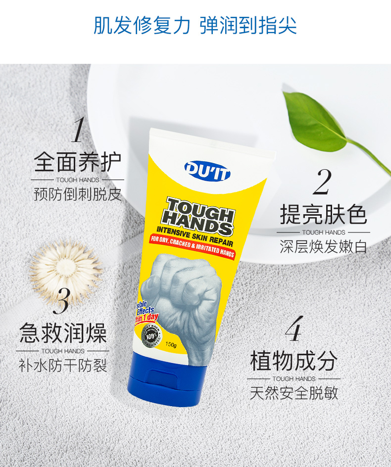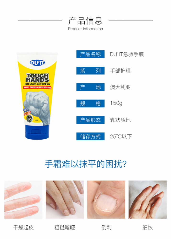 澳洲超火的一款手膜/护手霜!5天内快速修复粗糙和干裂,让您拥有白嫩的双手再也不是梦。富含维生素E、果酸、茶树等,专治各种手部干裂、粗糙、裂纹,有效去除手部的角质,改善手部肌肤,滋润保湿维持肌肤水分平衡,消炎杀菌,增强促进肌肤愈合,为手部肌肤建立天然屏障。使用方式:一开始比较严重的时候,主要在于晚上清洗完手后,涂抹上一层厚实的护手霜/护脚霜,然后按摩让它吸收掉,有利于恢复。早上洁面后顺带涂抹一次,用量不用很多,起到滋润的作用。每天晚上睡觉之前涂两层可以当做手膜!!