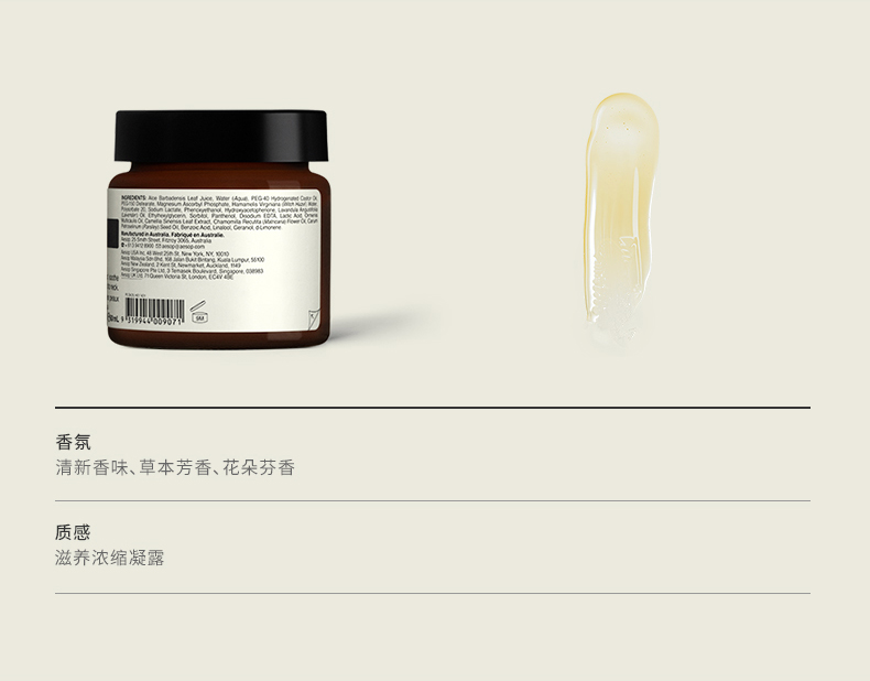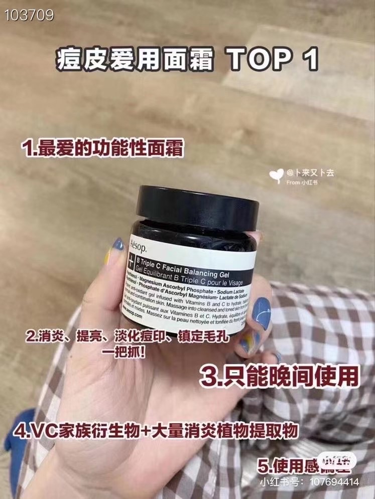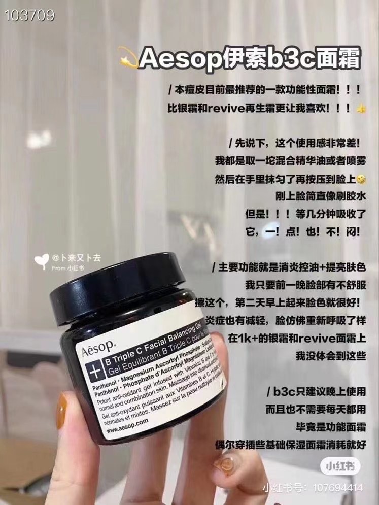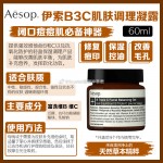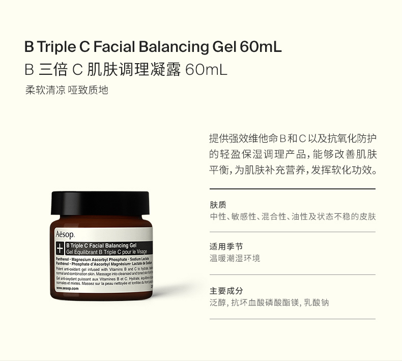 大名鼎鼎的Aesop伊索B三倍C肌肤调理凝露60毫升 Aesop伊索最牛逼功效单瓶【Aesop伊索B三倍C/B3C肌肤调理凝露60毫升】 适合需要均匀肤色,脸上有痘痘闭口粉刺的姑娘们。 含丰富的维他命、具抗氧化的调理凝露,有四分之一是维他命B、四分之三是维他命C! 伊索是把它归类到面霜… 它适合所有肤质,尤其适合油皮。 功效:全能调理,抗氧化,控油平衡,淡斑祛痘印收毛孔。 B3C可以单独用,功效是控油平衡、淡斑去痘印、镇定痘痘、收细毛孔。 因为需要避光,所以只能晚上用。记住,只有B3C需要避光,香芹籽精露或者香芹籽系列都是不要避光的。 B3C要介绍两种用法,以前只是强调B3C当作过夜面膜;现在增加一种作为面霜(因为要避光所以只能做晚霜)