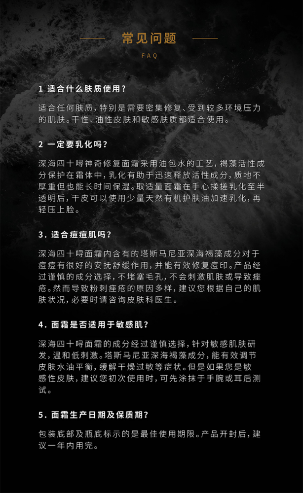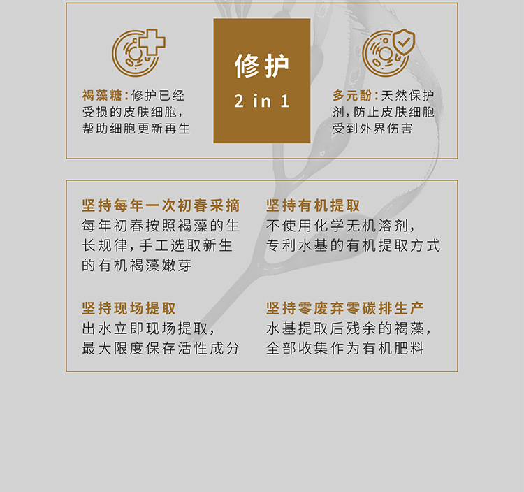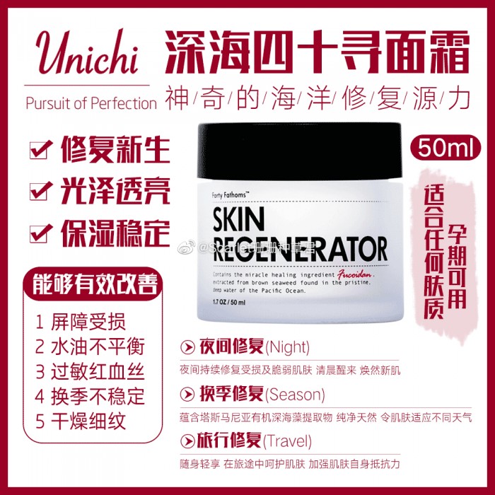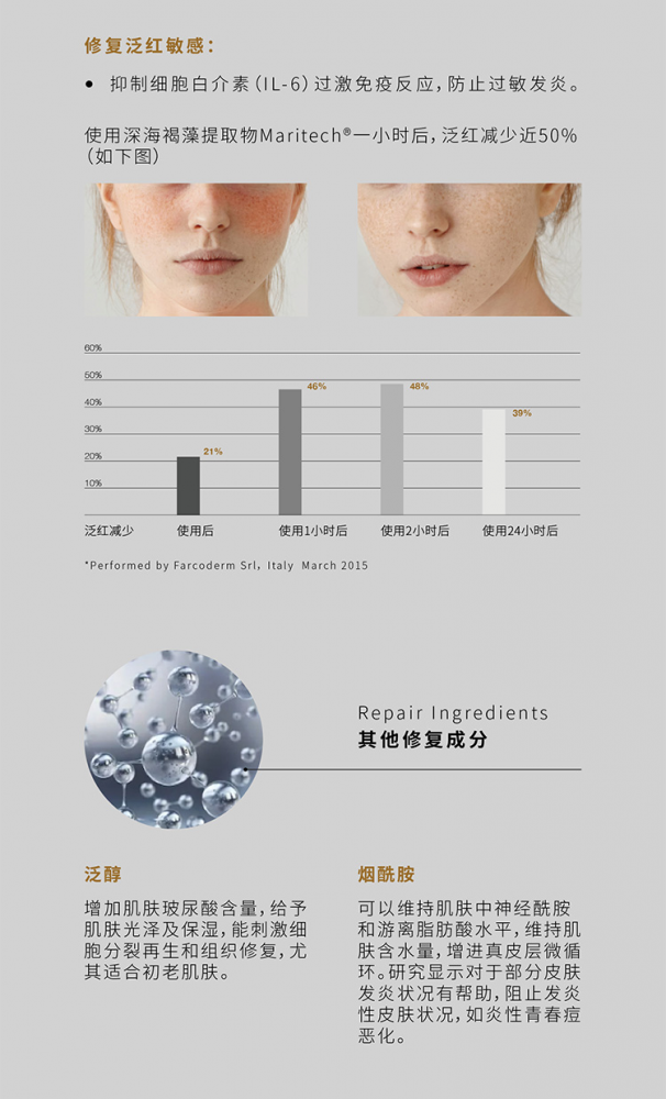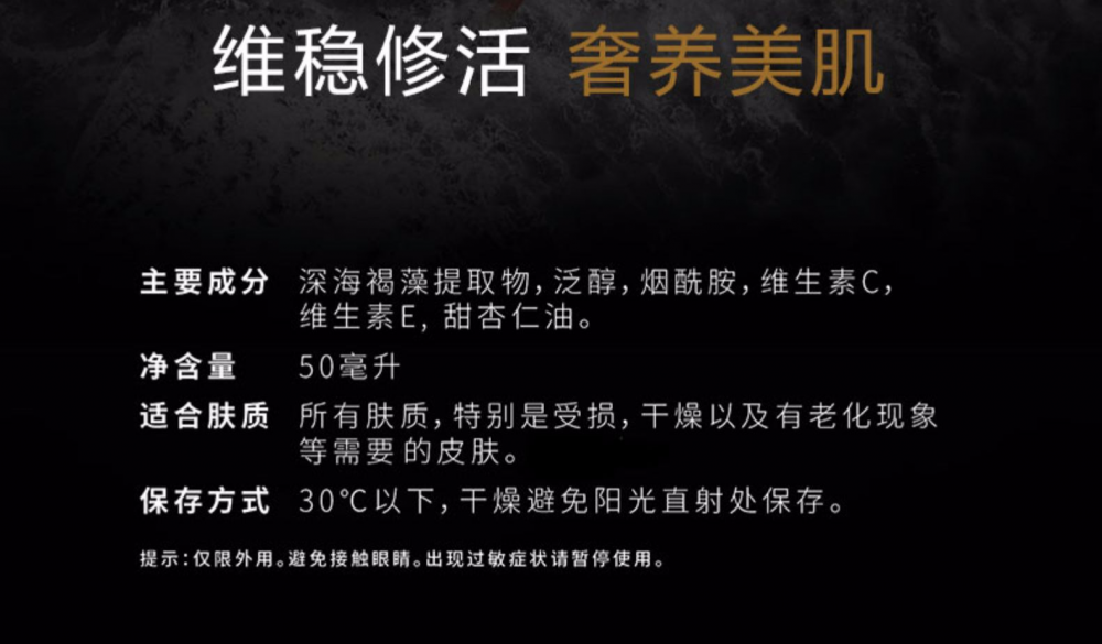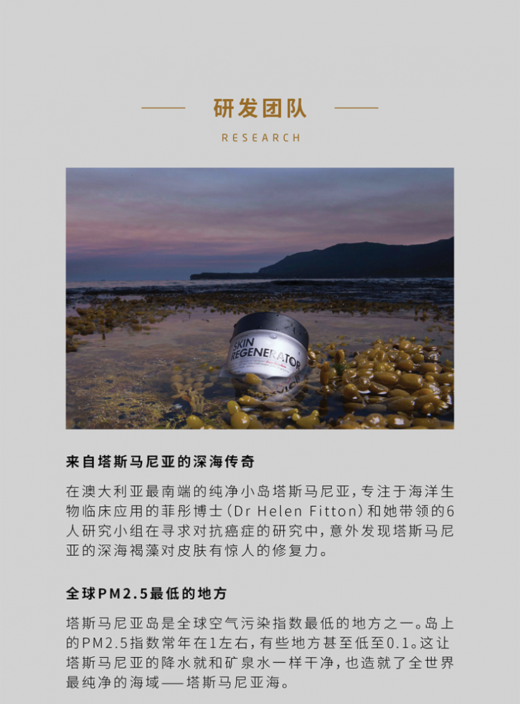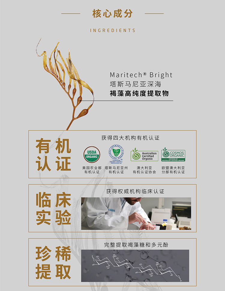 毫无疑问的它是澳洲本土销量冠军的面霜产品!为什么?因为其强大的神奇修复功能常被拿来和La Mer面霜做对比! 源自澳洲最美岛屿塔斯马尼亚深海褐色巨藻,澳洲抗癌研究专家在攻克皮肤癌的道路上发现了塔斯马尼亚深海褐藻对皮肤的强大修复力,其活性物质含量是其他巨藻品种的近2倍。申请面霜最大程度保存深海褐藻修复能力的提取方式,其珍贵的植物发酵原液Maritech Bright,强大功能已经获得临床证实,可从根本上促进肌肤修复新生。 产品功效: - 滋润保湿:含有精华修复成分,全天滋润保湿。能有效的修复因为辐射、雾霾、 化学物质侵害的肌肤,使肌肤保持完美状态。 - 维持肌肤活力:产品能够平衡肌肤的PH值,保证水油平衡,提升肌肤细胞活力,促进肌肤细胞更新,具有抗氧化。 - 修复肌肤:面霜能修复肌肤,淡化痘印痘痕,淡化色斑色素,均衡肌肤肤色。修复敏感肌、干燥肌以及创伤肌肤。 适用于:皮肤干燥 皮肤换季敏感 红肿发炎 痘痘肌