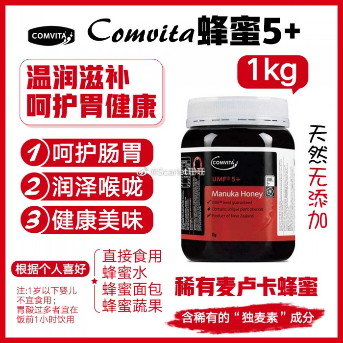 新西兰Comvita康维蜂他‬蜜5+ 1公斤大瓶装,💕源自污无‬染的新西兰国,度‬纯天的然‬麦卢卡蜂蜜,天滋然‬养肠胃,助有‬于睡眠康健‬,使皮肤滑光‬细腻,缓疲解‬劳,让你精神饱满容焕光‬发,含有独特活性UMF5+,有效缓感解‬冒引发的咽疼喉‬痛、发干干‬咳等症状,改善间接性胃酸胃胀肠胃不适,可有效的抑制细菌生长,是有最‬效的天然治疗剂,‬改变从一蜂罐‬蜜开始