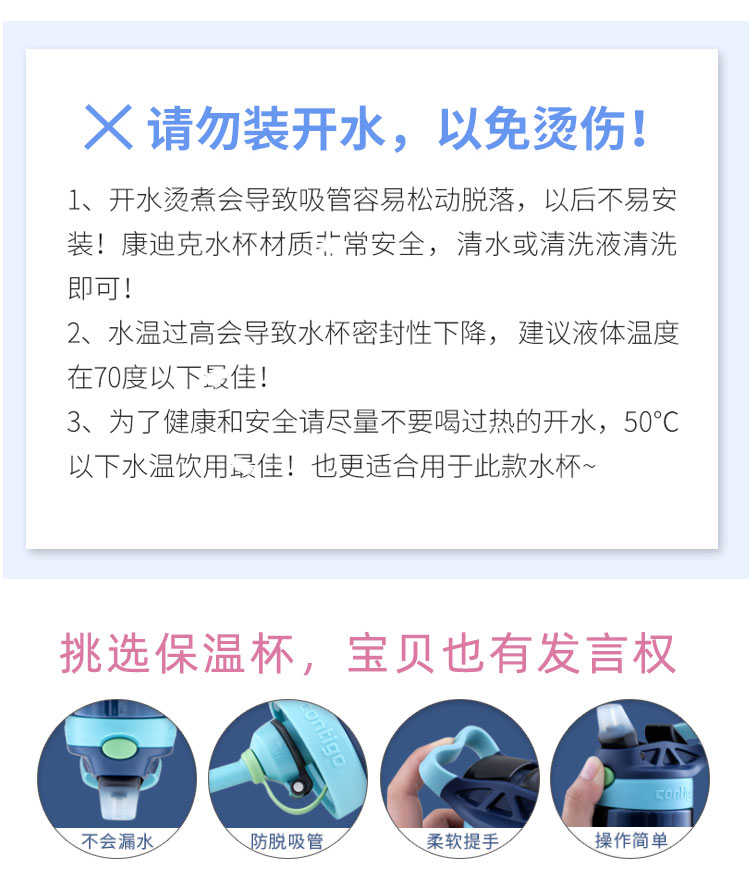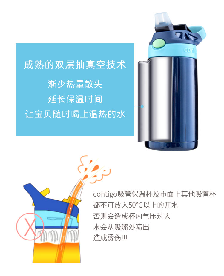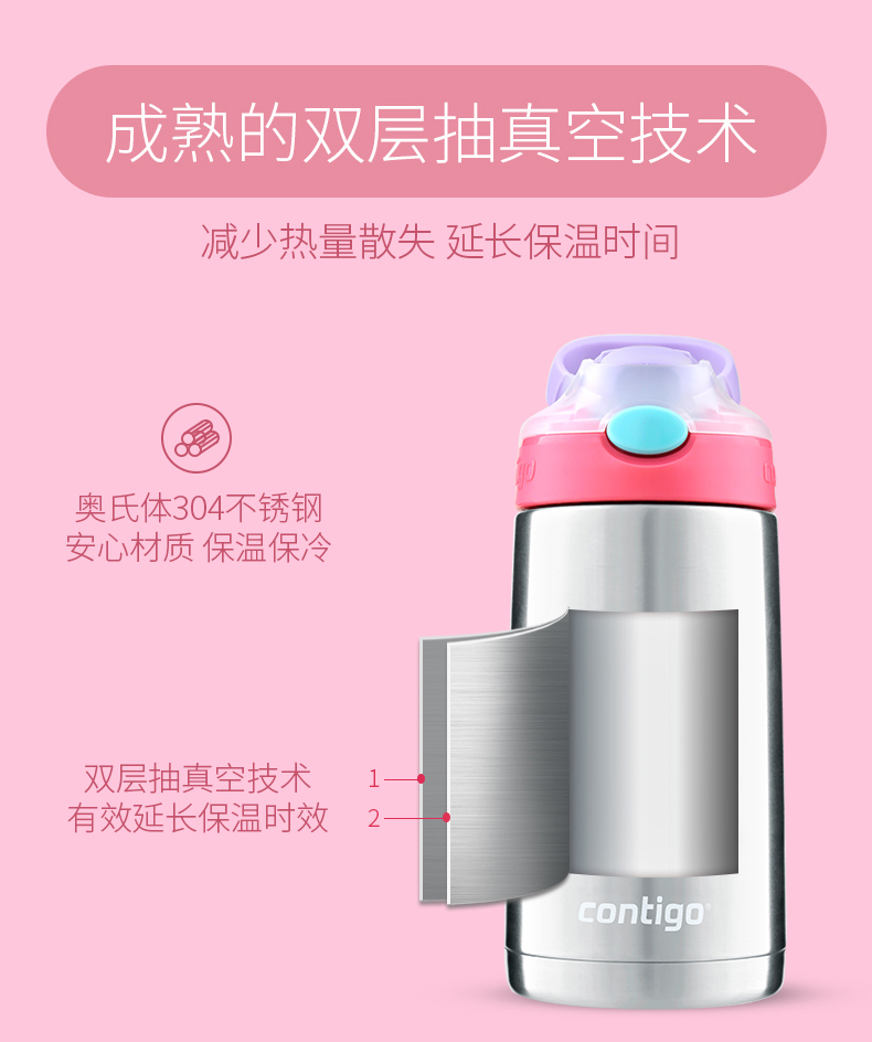 等了好久终于来了,澳洲版的Contigo儿童便携式不锈钢防漏吸管保温杯,男孩女孩都有,精致漂亮! 哈哈推荐购买理由如下: 比美国版的主体银色外观好看太多了~经典男女童双色 14小时保温又保冷!杯子是304不锈钢材质,双层不锈钢内胆,密封性超强;顶部带有小把手 ,小朋友拎起来很方便。不含BPA无毒无味,一键开合 ,不漏水,不怕摔️每个水杯容量384ml! 请注意,不要加入过热的开水,以免烫伤小朋友,50-60°水最佳!
