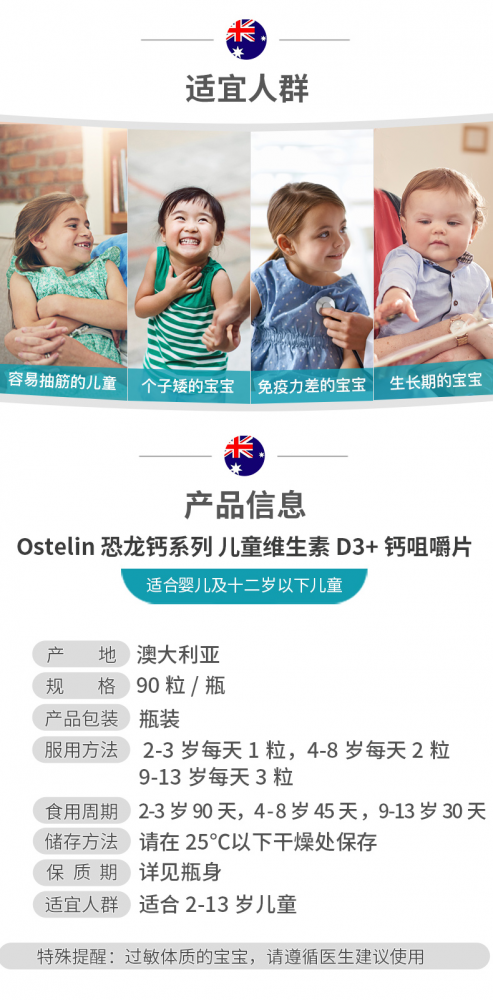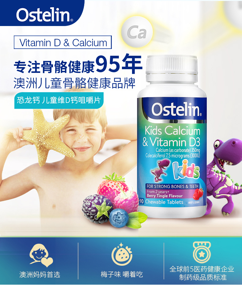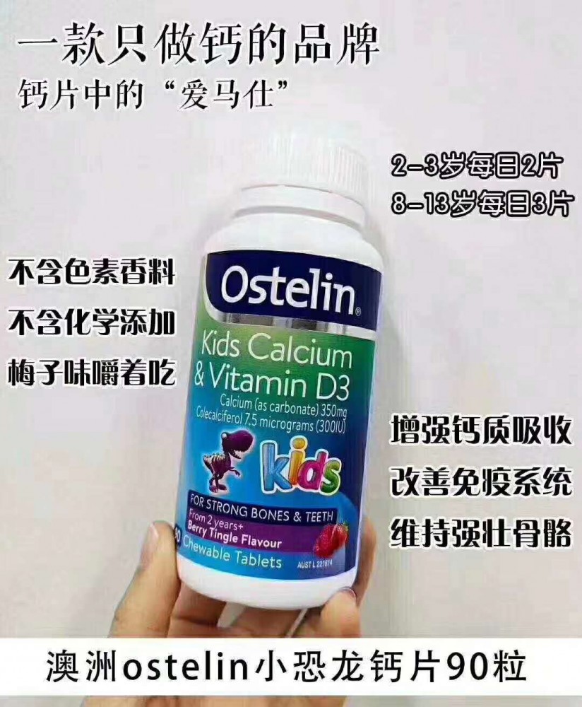 Ostelin是澳洲最专注最专业生产钙和维生素D类产品的品牌!他家没有其他类型的保健品! 该款恐龙钙(可吃30-45天)适合2岁以上的儿童,梅子汽水口味,咀嚼食用! 补钙的重要性无需多言,同类产品里没有比这个更合适的了! 强壮骨骼、牙齿,改善骨质疏松和免疫系统,增强钙吸收!