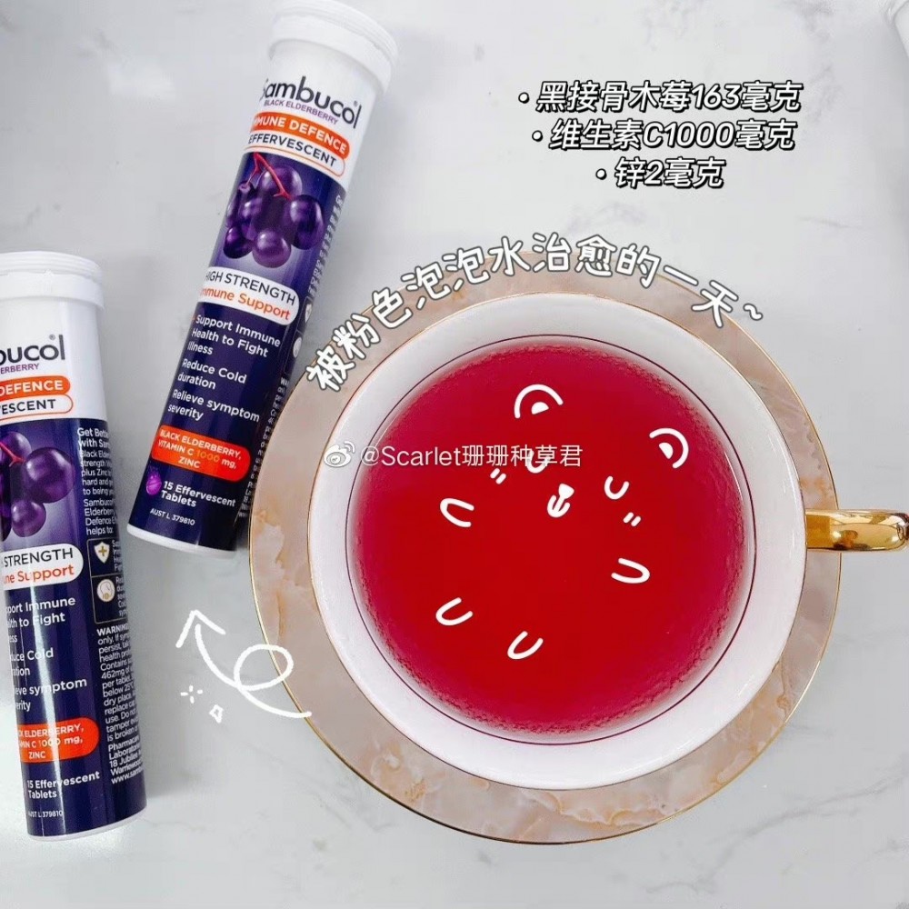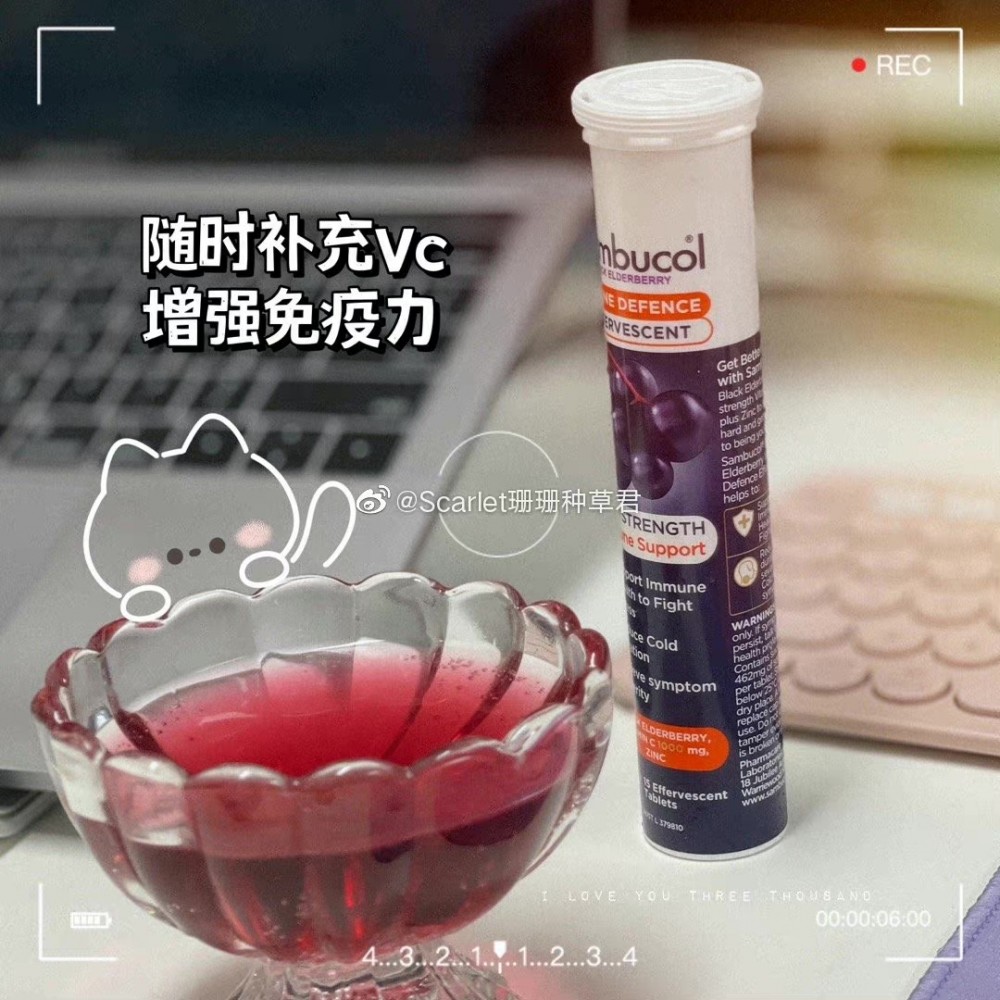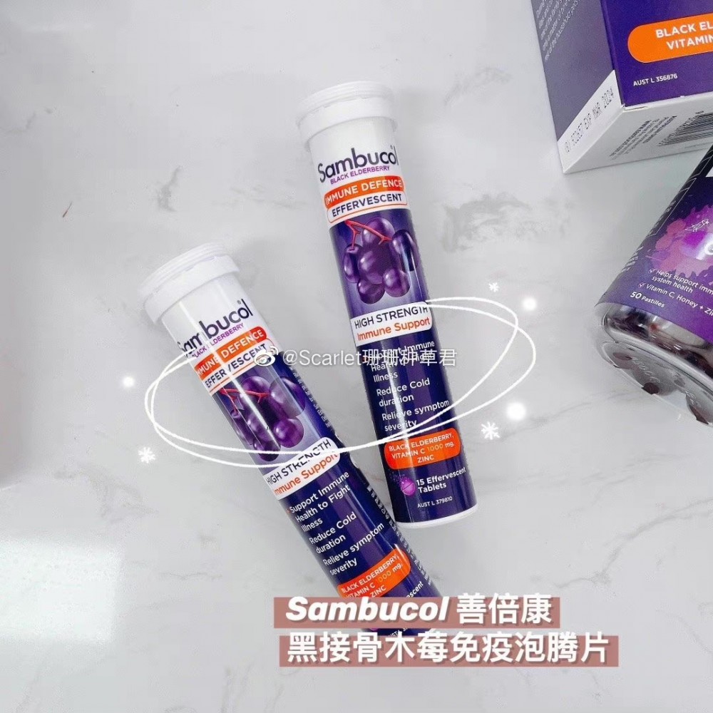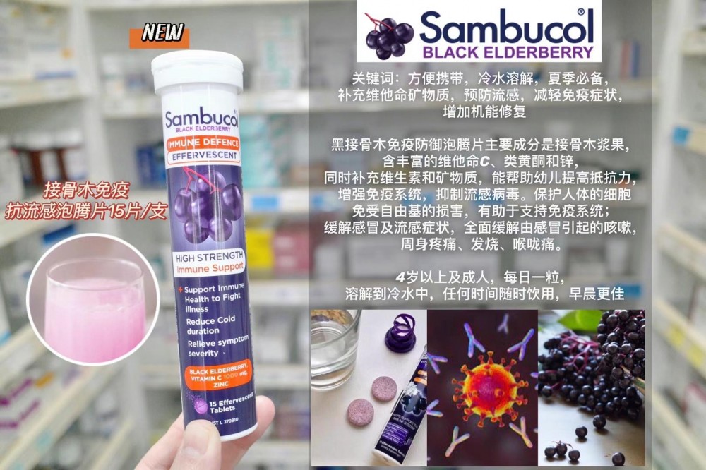 Sambucol主要致力于缓解感冒症状、提高免疫力、预防流感等产品!专业性极高!他们家的小黑果免疫力糖浆销量一直位居同类产品冠军! 这款泡腾片产品4岁以上儿童和成人均可服用,每日一粒,冷水溶解!能有效预防流感,缓解感冒症状并提升全身免疫力!主要成分:接骨木浆果、1000mg高含量维C、锌等!!对比同类Swisse产品,其优势在于调节并提高免疫力,更高的维C及锌含量!!
