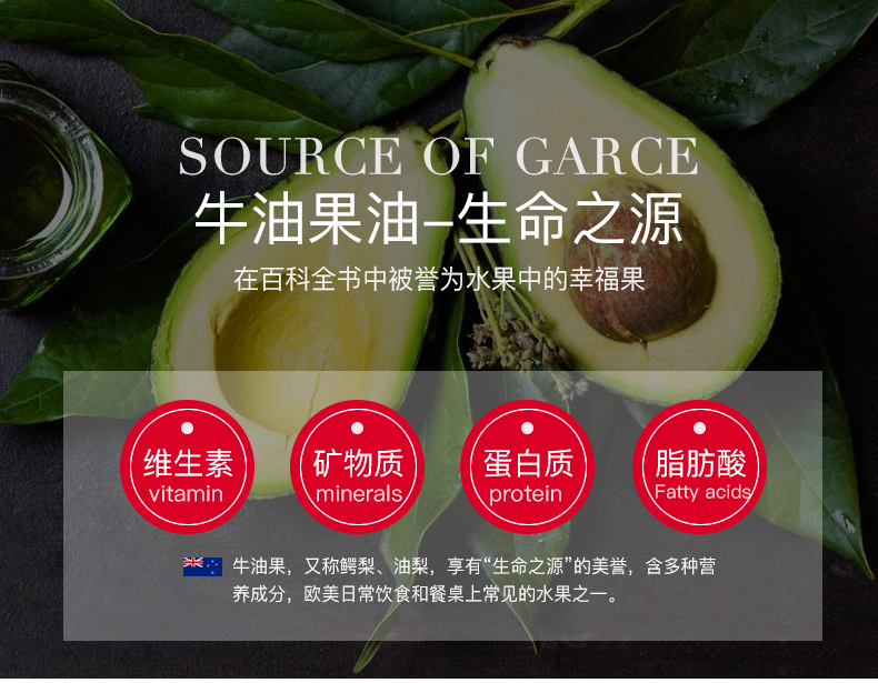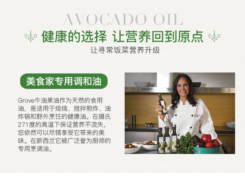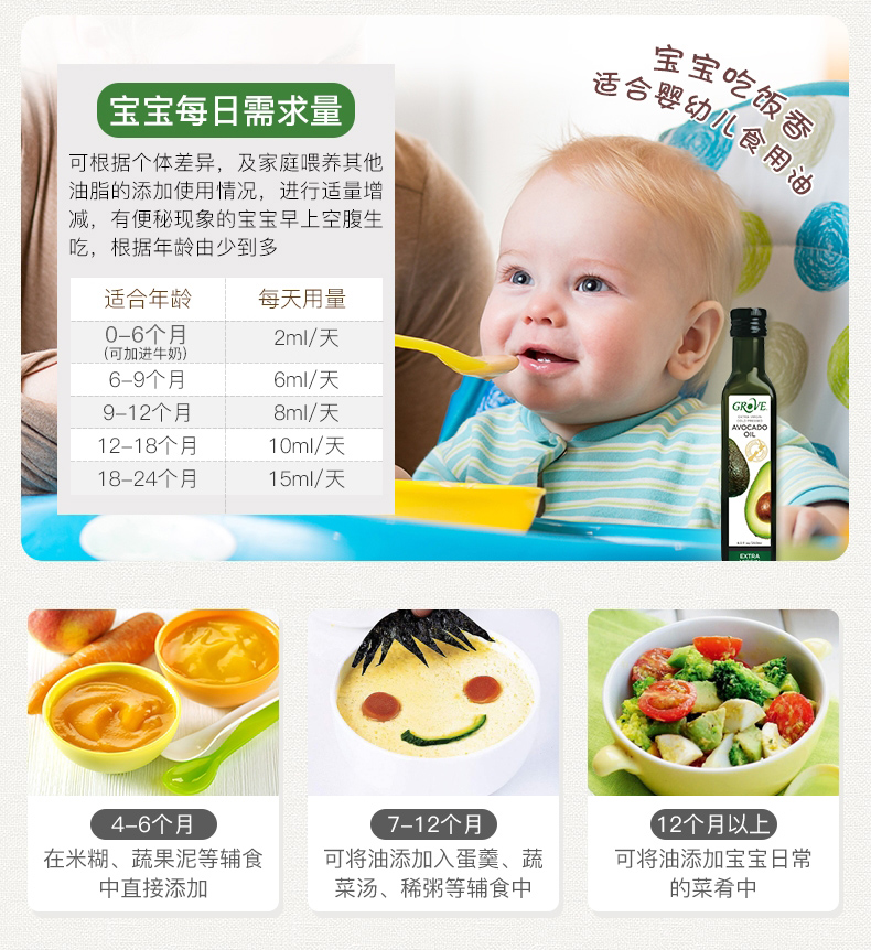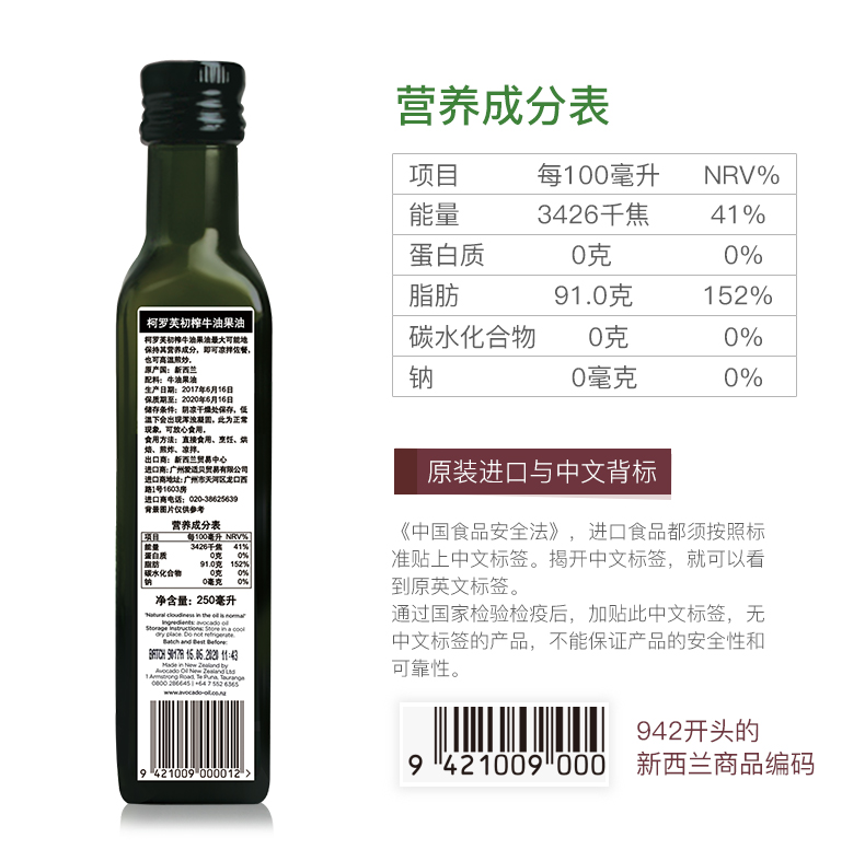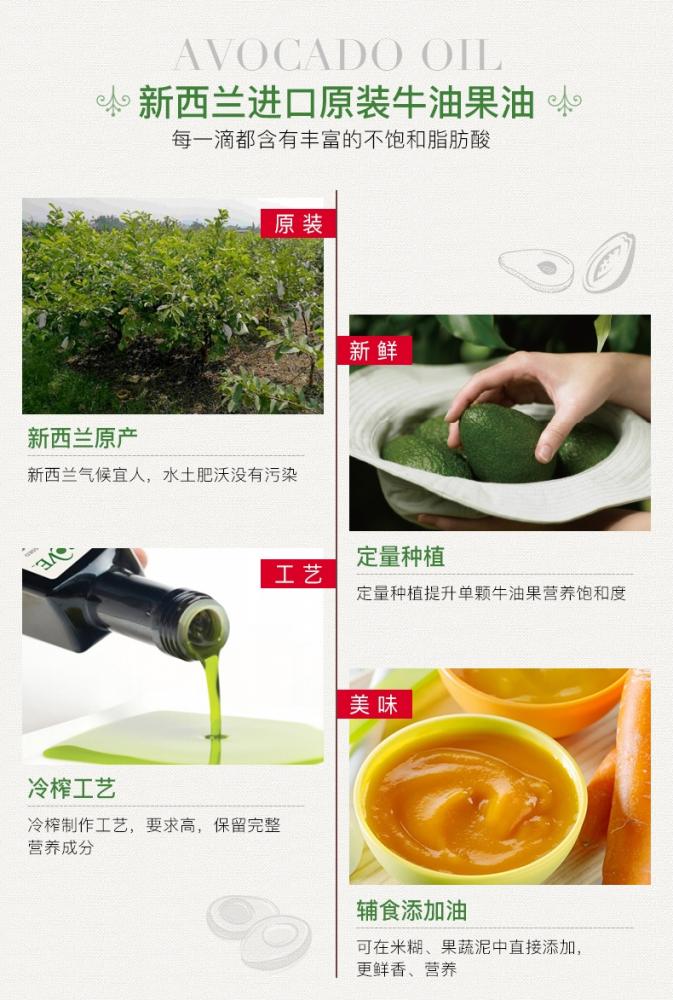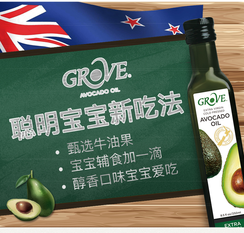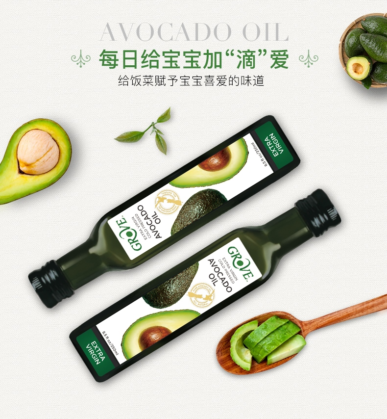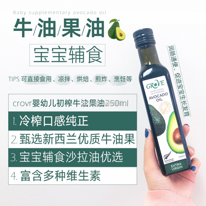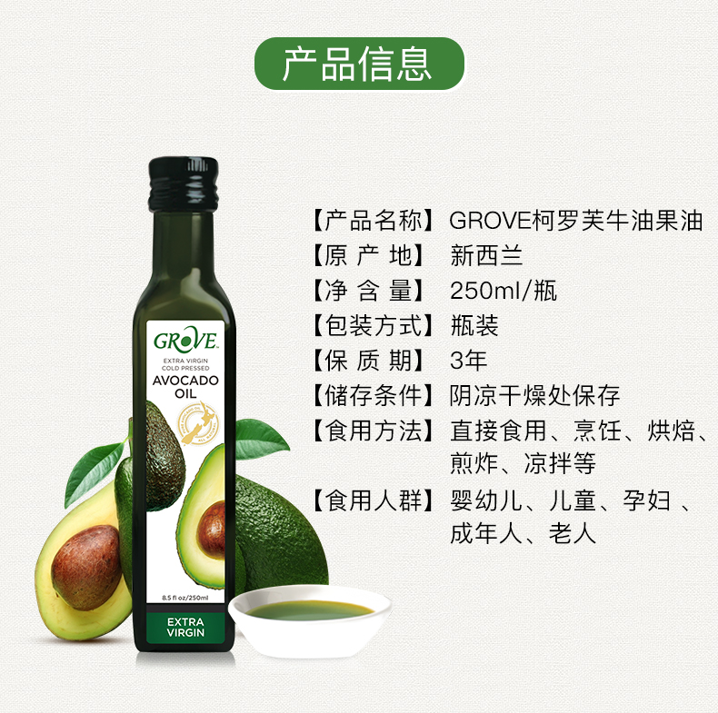 新西兰 Grove 冷压初榨牛油果油 250毫升,牛油果,被誉为“生命之源”,富含维他命、矿物质、蛋白质、不饱和脂肪酸、亚油酸、omega 3/6、DHA、谷固醇、天然叶酸等,营养价值极高,誉为果中之王!不夸张的说只需几滴,就能让宝宝的营养更均衡,温柔的口感添加在辅食中,是无法拒绝的美味,宝宝不再挑食❗ 先进的低温冷榨工艺,完全保留营养成分,新西兰本地生长的牛油果,萃取第一道精华,不含任何添加,高温271°C仍保持营养不流失,尤其适合宝宝、孕妇和老人❗