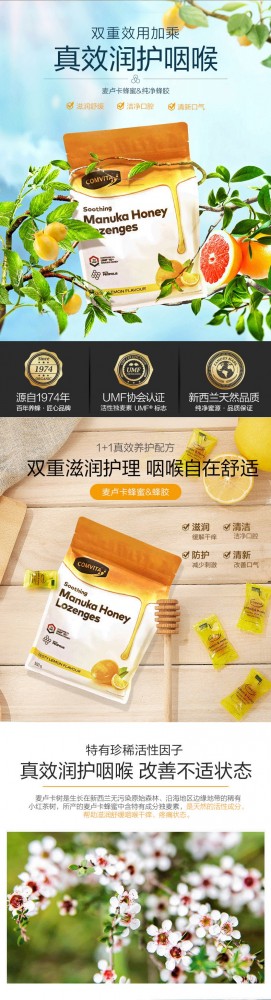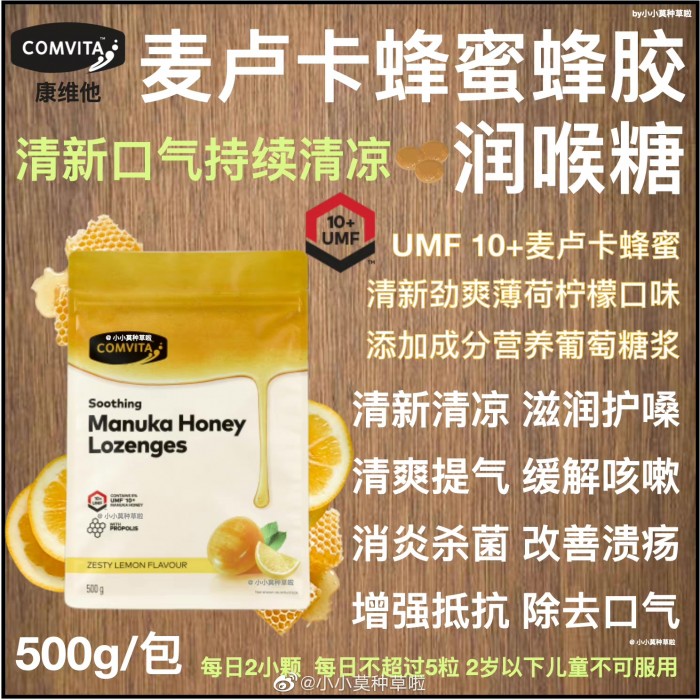 🙋换新包装啦~最新保质期~大家都非常喜爱的Comvita康维他UMF10蜂胶糖润喉糖500克大包装!! 它毫无疑问🍬是澳洲新西兰最受欢迎👑的天然喉咙含片。每片含有康维他最独特的麦卢卡蜂蜜UMF10+相当于90毫克蜂胶,有效快速缓解各种口腔及咽喉炎症,止咳效果巨佳,增强儿童抵抗力,消除口臭,清新口气!👼 🙅不含任何人工甜味剂,绝🈚️防腐剂!!超好吃的柠檬口味!!每天2小颗,咳嗽远离我!!2岁以上儿童均可放心使用,每天不要超过5颗!
