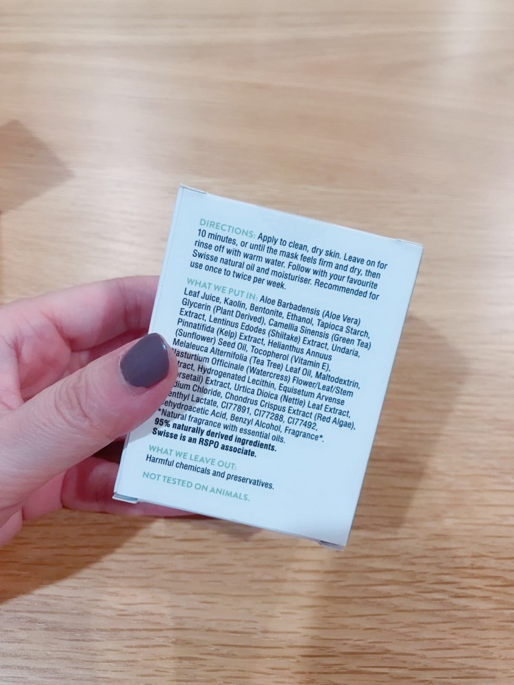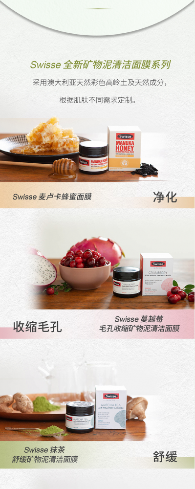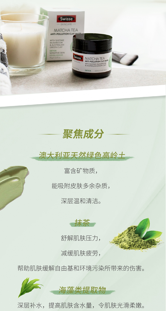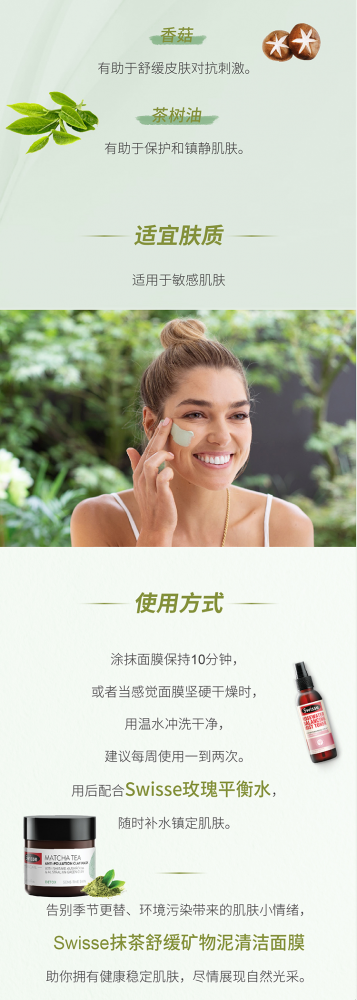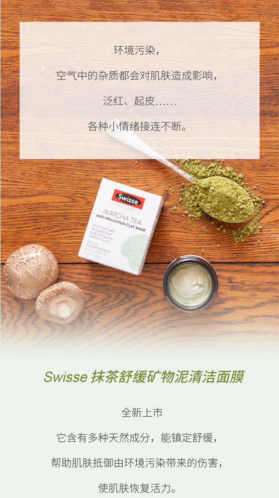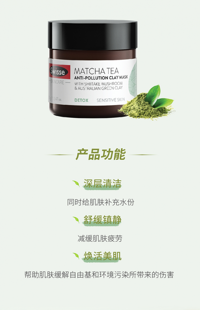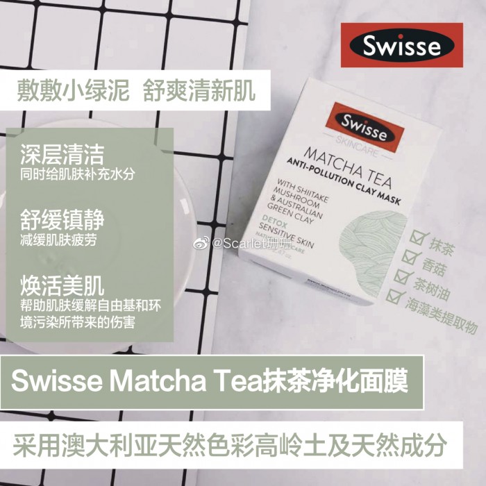 抹茶控必备 🇦🇺Swisse抹茶舒缓排毒绿泥面膜,除了抹茶香外还有一股杏仁的淡淡清香,涂抹10分钟后清洗干净,脸上有清凉的感觉,皮肤变得萌萌哒。这款面膜含有的抹茶精华可以保护肌肤不受辐射伤害,香菇精华能帮助肌肤光滑不敏感,芦荟提取物有保湿嫩肤的功效,茶树成分起到镇静舒缓的作用。