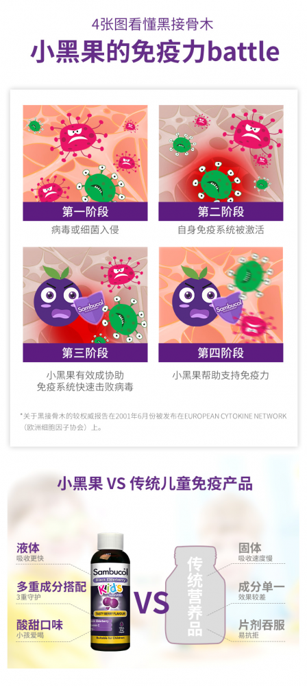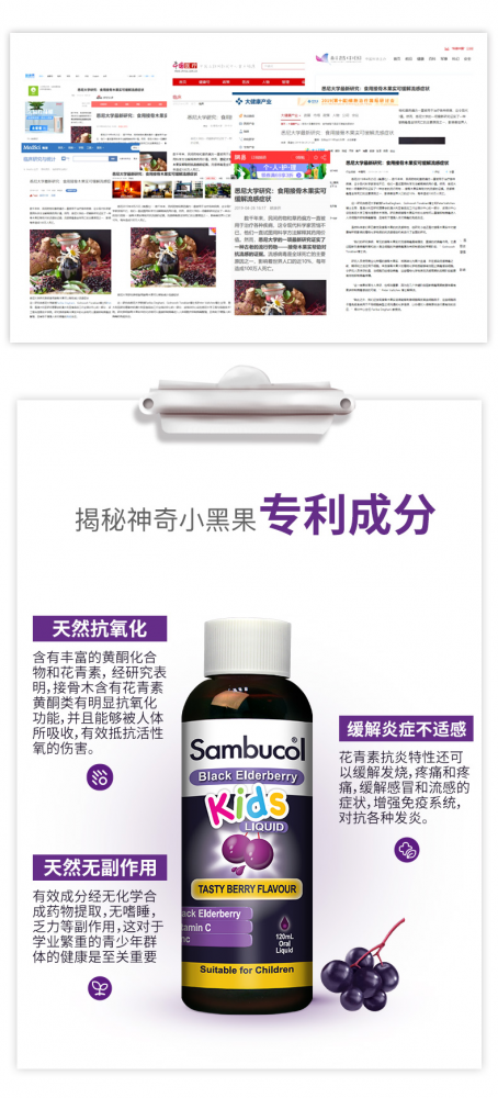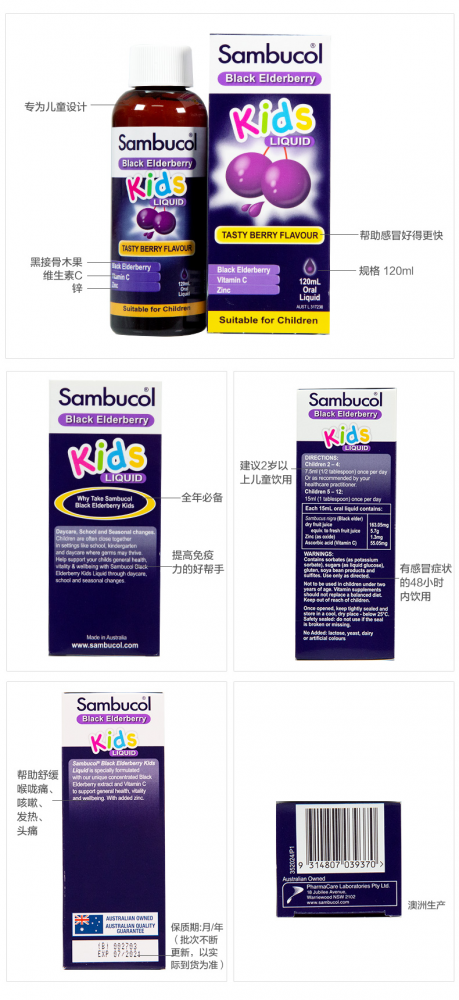 抗病毒、预防感冒+提高自身免疫力!它无所不能,也是我在澳洲的居家必备! 专为2岁以上的儿童及成人舒缓感冒及流感症状研制,口感舒适。蕴含有高品质黑接骨木提取物、维生素C、葡萄糖酸锌等活性精华成分。黑接骨木提取物含有高水平天然抗氧化剂,以保护人体的细胞免受自由基的损害,有助于支持免疫系统;缓解感冒及流感症状,全面缓解由感冒引起的咳嗽,周身疼痛、发烧、喉咙痛。