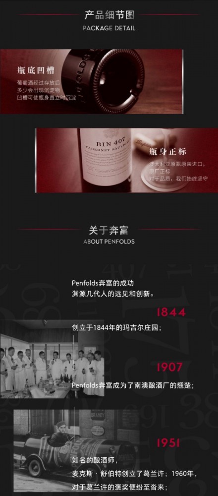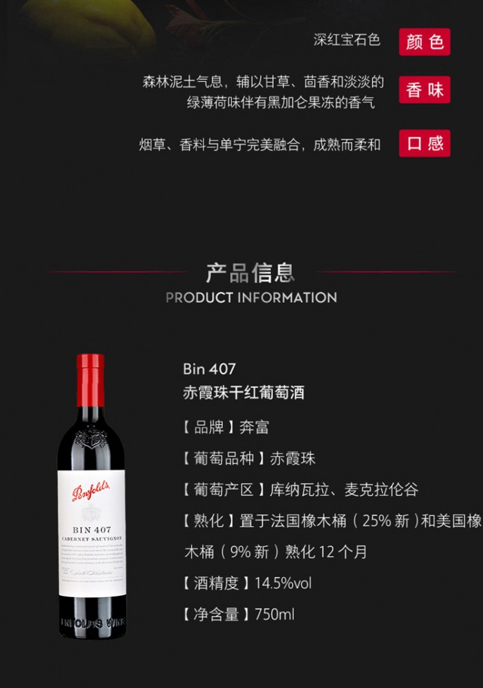 直白的说:澳洲“Penfolds”奔富 = 中国“茅台”~无论是地位、口感、收藏价值均是如此! 懂酒的都知道Penfolds奔富407在国内火爆到一瓶难求,假货遍地!尤其是进入下半年更是基本断货! 和茱莉蔻化妆品一样,奔富酒厂及其葡萄庄园在南澳州,刚好是我们定居的地方,采购有天然优势! 作为旗舰产品的407赤霞珠干红葡萄酒,除去开瓶即饮的快感,若经过十年以上的瓶储,口味会变得更佳丰满、醇厚、浓郁,成为名副其实的陈酿佳酒!极具收藏价值!无论送礼还是聚餐,面子给足!!! 这款407来自2017产季,螺口,瓶身有浮雕,直邮保真!数量有限,单瓶可直邮!下单趁早!