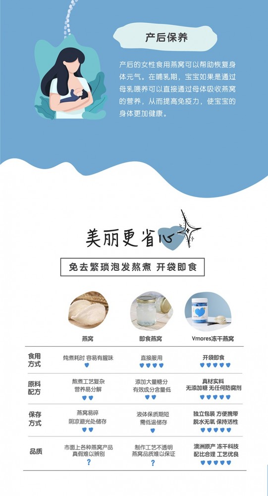 原料来自马来西亚白燕!爆款担当!不仅仅是孕妇,每个男孩女孩都应该多吃燕窝,来保持自己的肌肤状态和身体健康。这款Vmores冻干燕窝,采用阿波罗计划中研发的FD冻干技术,在零下40度急速冷冻而成,每一盏都保持了95%以上的生物活性,以酸奶为基底料,制成小糕点状,方便快捷!促进大脑发育、修复皮肤细胞、孕期滋补、强健骨骼、恢复元气、改善副作用、补养病体、补肺养阴、预防疾病,它几乎无所不能~