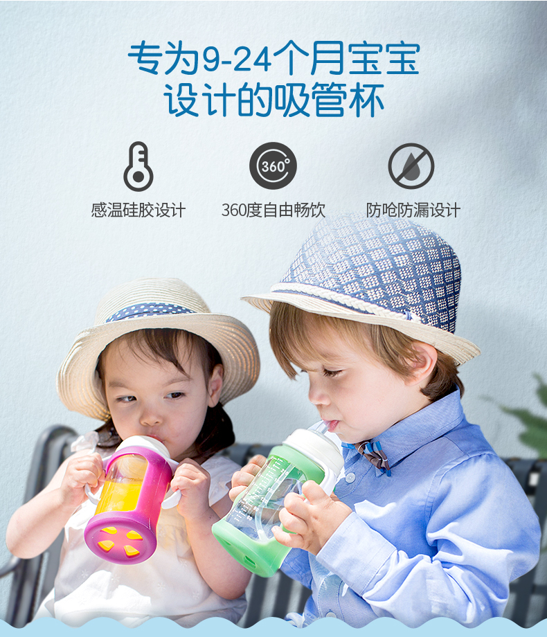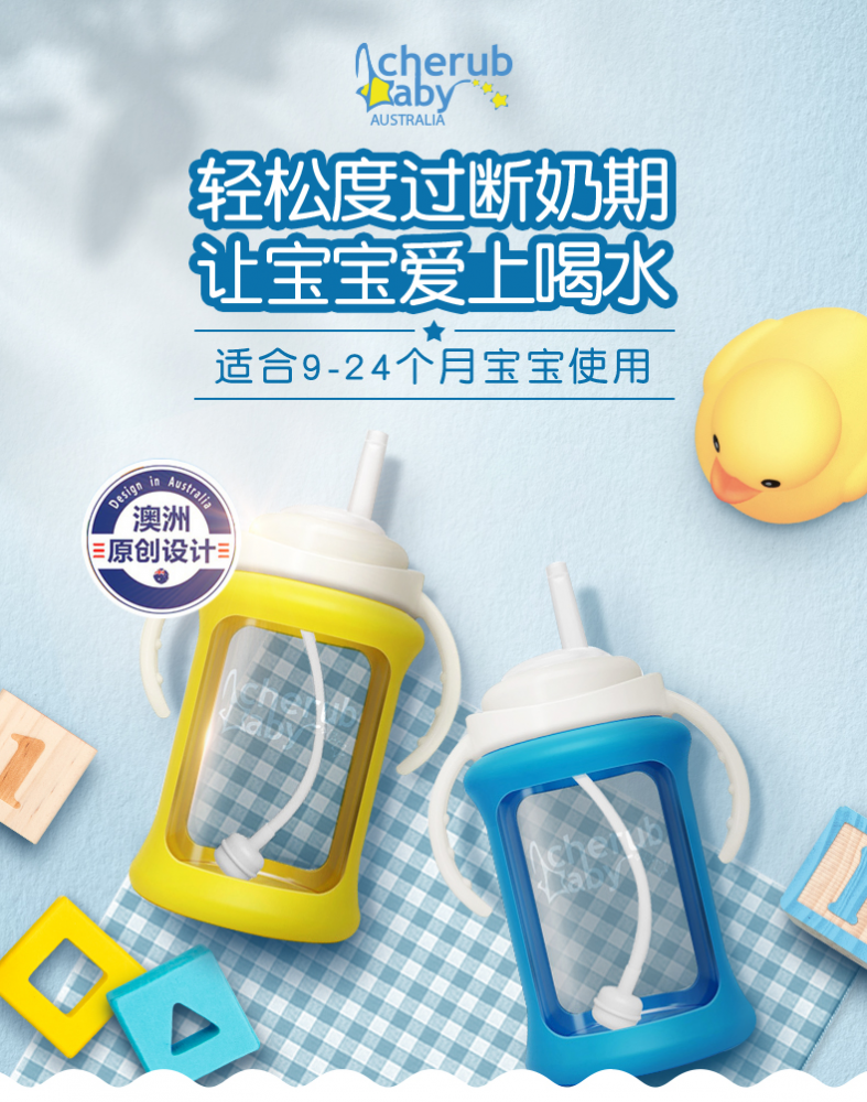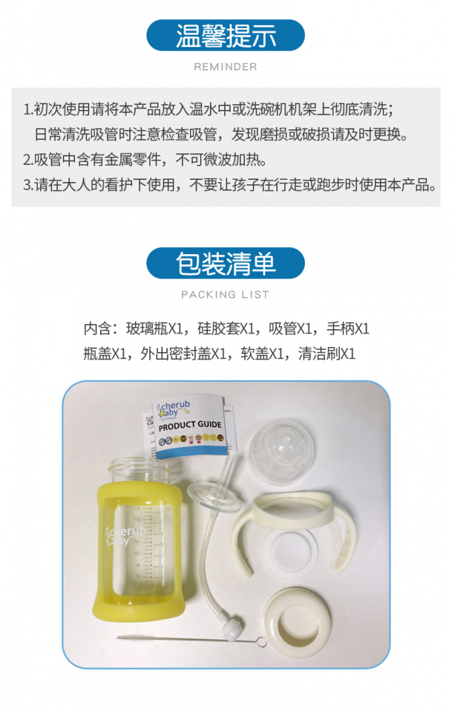 6色可选!【Cherub Baby防呛温度指示高硼硅玻璃学饮杯/奶瓶240毫升】 最近很多宝妈推荐采购的一款评价最高的奶瓶/学饮杯二合一产品! 首先要说是高硼硅玻璃材质!耐高温600°!安全无毒耐磨损!易清洗消毒不变质! 其专利硅胶套有温度指示功能,在倒入超过42°的液体时会自动变成白色!保证您能用最佳的水温冲调奶粉或者饮用水~ 欧美高标准玻璃原料,高强度高硬度,无任何化学添加物,防漏防呛,360°重力球让宝宝任意角度都能饮用! 包装内含玻璃瓶、硅胶套、吸管、手柄、瓶盖、外出密封瓶盖、软盖、清洁刷,一应俱全!