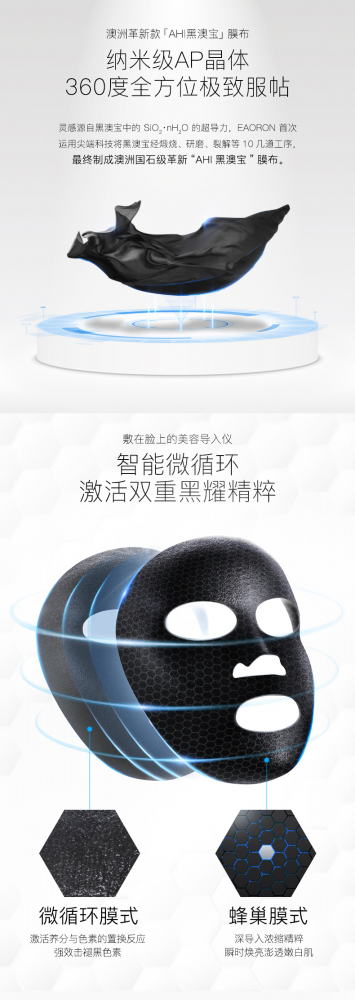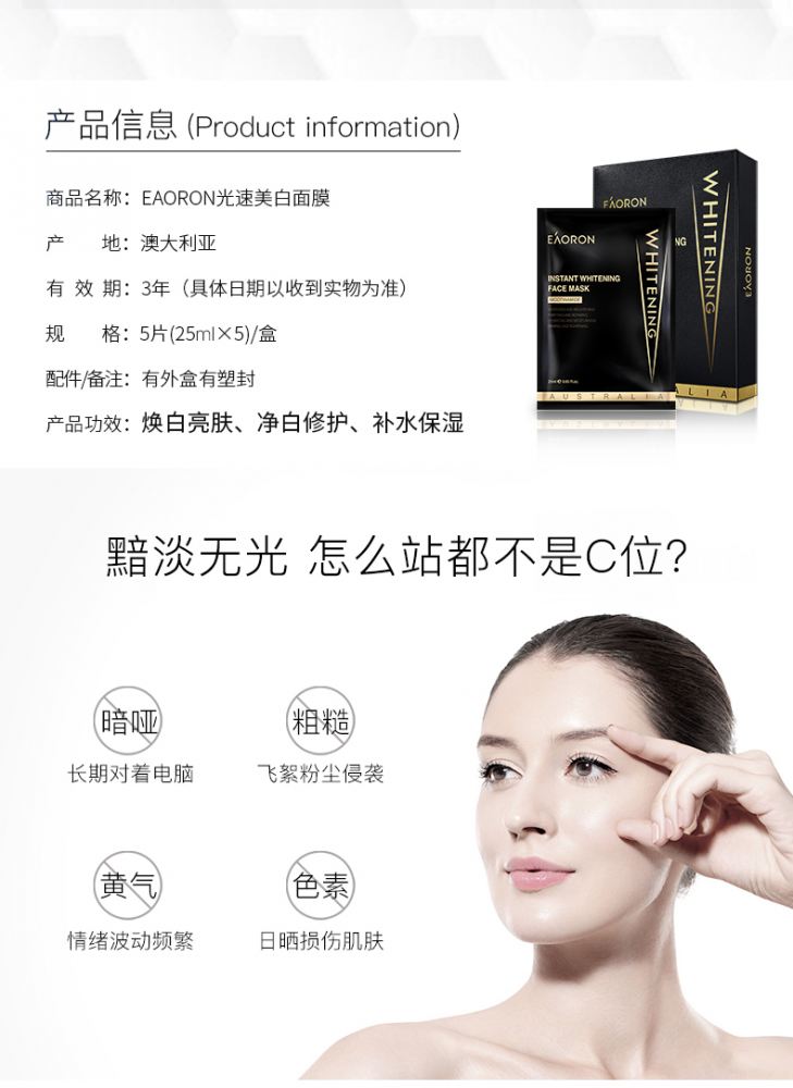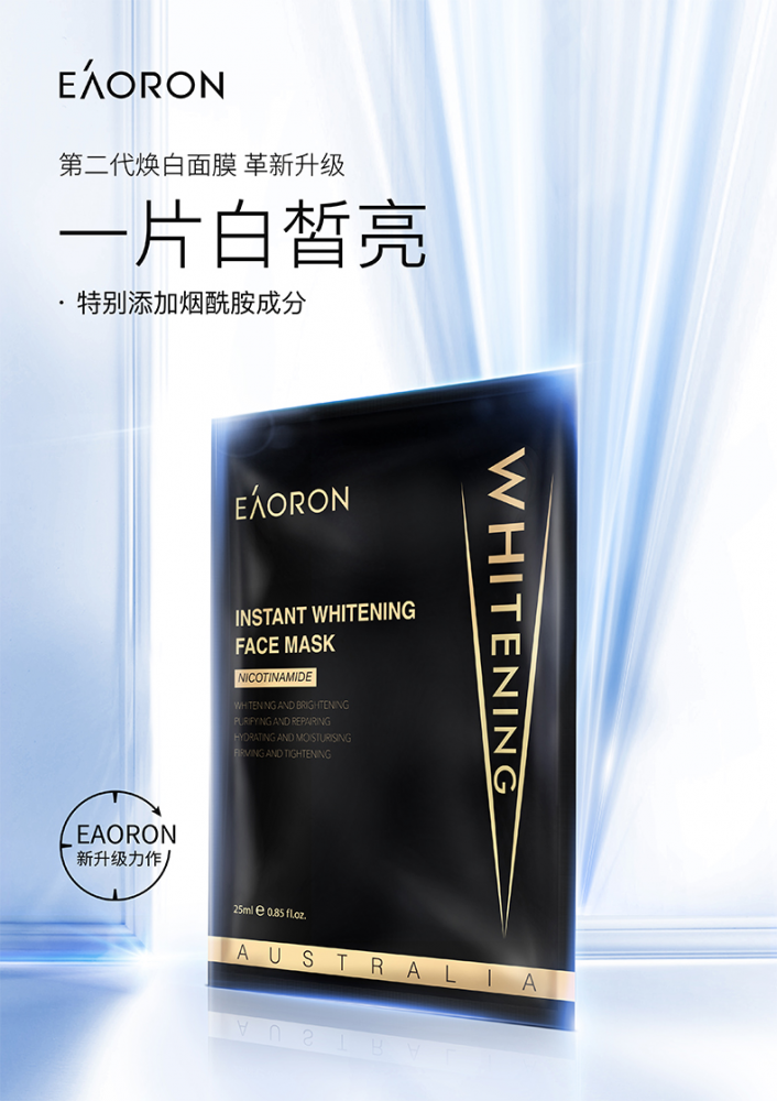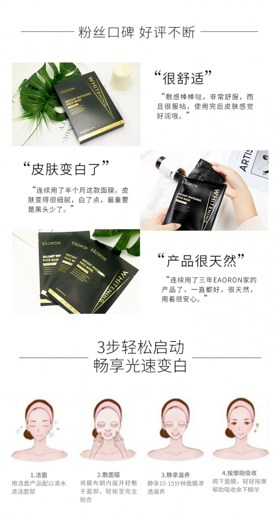 【Eaoron水光针极速亮白补水保湿提亮黑面膜5片装】 美白提亮补水保湿黑膜采用澳洲长绒膜布,添加木炭中的长碳,让肌肤主动吸水,分子细小,快速渗透肌底,营养成分更多,更易吸收。含多种植物成分,调节皮脂分泌,有助保溼及嫩白,还你白嫩肌肤。澳洲Eaoron 水光针面膜,补水、保湿,纯植物纤维膜片、轻、薄、透气、隐形、安全,符合婴儿肌肤标准。每片满满的25ml澳洲植物补水精华,服服帖帖在脸上每一寸肌肤!!