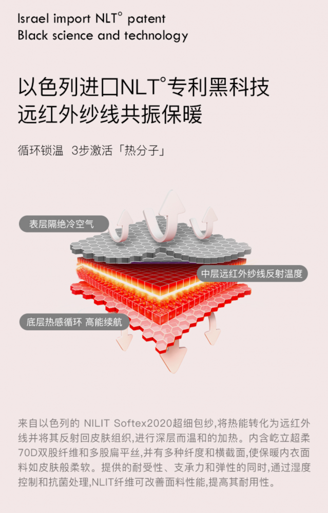 版型修身!材质柔软!高弹舒适! 玻尿酸微胶囊小分子材质持久润肤,保湿并最大程度减少静电!拒绝秋冬臃肿!以色列进口NLT专利黑科技远红外纱线共振保暖,使你整个秋冬迷人又保暖!!先进的设计理念和精湛的工艺技术,3D修身裁剪编织,提取人体数据,由点及线,一体成型!