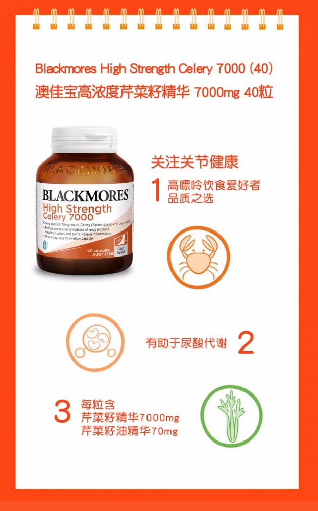 【Blackmores高浓度7000mg西芹籽痛风灵40粒】 区别于50粒的常规版的3000mg含量,新品的芹菜籽精华(胶囊)含量高达7000mg,一天一粒,可服用40天,基本上=常规版2瓶! 它是"痛风"史上最牛的芹菜籽!传统的草本配方,能极有效的缓解痛风、关节疼痛、风湿痛!它亦是一种温和的利尿剂,可有效改善关节炎、风湿病和痛风所引发的症状!!