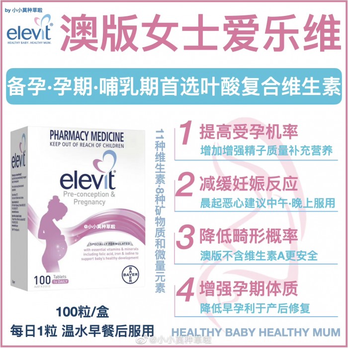 新包装啦!!最新保质期【Elevit女性爱乐维/叶酸100粒】现货到了!下单秒发!咱家价格棒! 拜耳澳洲本土版女士爱乐维,补充妈妈和胎儿所需营养,让胎儿更健康!想要备孕及准妈妈们爱乐维复合维生素片,是澳洲家庭医生唯一请注意是唯一哈️推荐的备孕,孕期,哺乳期保健品,公认的全球最佳备孕孕期哺乳类保健品!!!含多种维生素及矿物质。可以从备孕一直吃到哺乳期结束‼️一盒100片,每日一片,备孕提早三个月吃