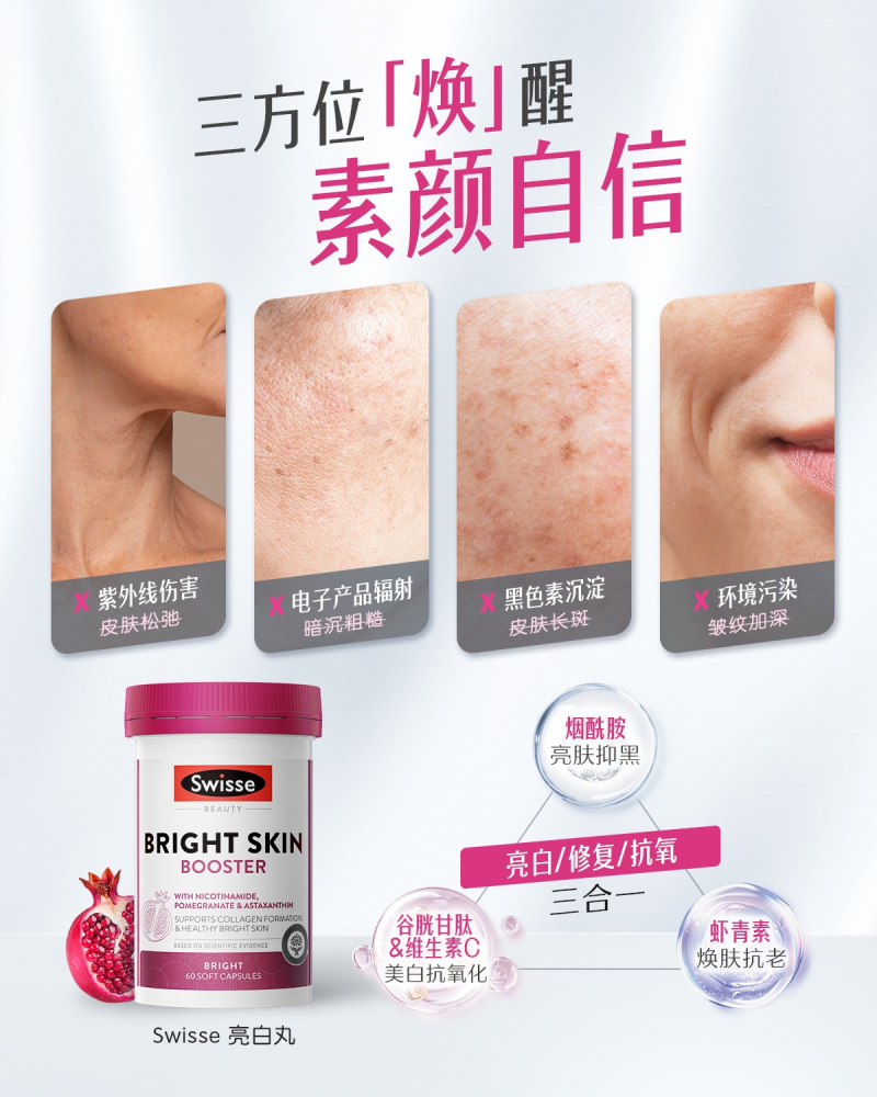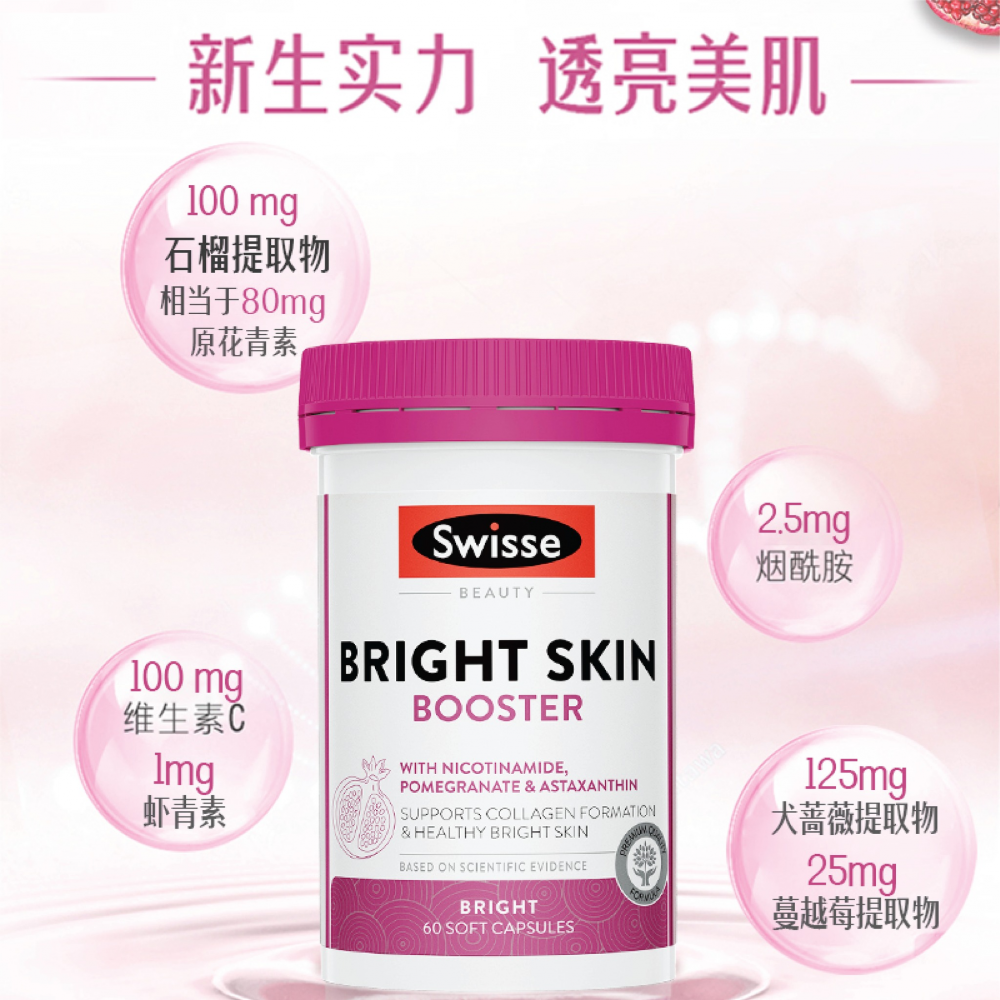 Swisse的亮肤发光片含有石榴提取物~ 并有丰富的原花青素,能够有效的控制黑色素的形成~ 还有烟酰胺可以改善肌肤色素沉淀的问题~ 最后有维他命C能够减少自由基的伤害,还原肌肤本色~ 三层的防护,让肌肤更加透亮~ 各位买起来,一起来爱护自己的皮肤吧