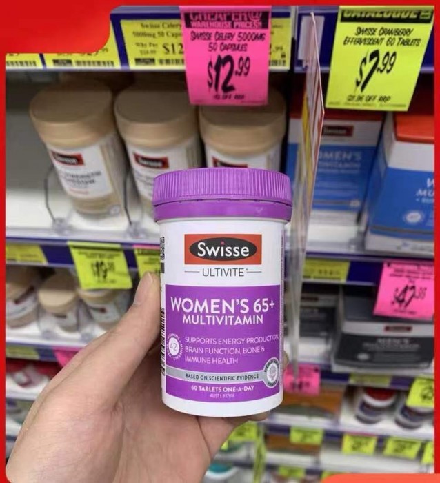 一般信息: Swisse Ultivite 女性65+复合维生素片采用优质配方,包含40种优质维生素、矿物质、抗氧化物、和草本植物,满足65岁以上女性的营养需求,维持机体健康。 该配方有助于:机体产生能量,保持精力旺盛,以及支持神经系统健康。 成分: 每片含: 维生素A 2500 IU (醋酸视网膜,750 mcg RE) 维生素E 24.2 IU(d - 生育酚 20 mg) 维生素B1(硫胺素50mg) 维生素B2(核黄素50毫克) 烟酰胺100毫克 维生素B5(泛酸100mg,从泛酸钙109.15 mg) 维生素B6(吡哆醇 41.1 mg / 盐酸吡哆醇 50mg) 维生素B12(氰钴胺200 mcg) 维生素D3 1000 IU(胆甾醇25 mcg) 生物素200微克 叶酸500微克 维生素K(植物甲萘醌 60 mcg) 维生素C(抗坏血酸。 使用方法: 每日1粒随餐服用。