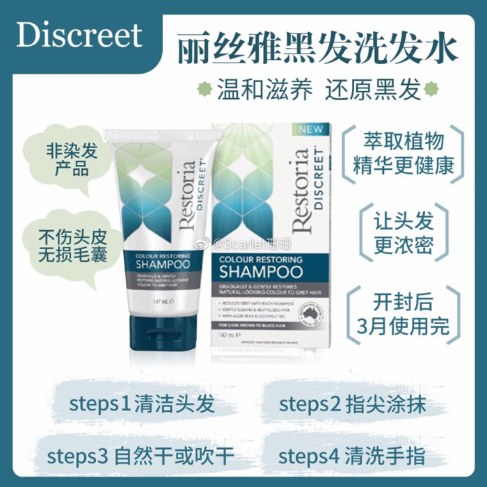 【Restoria】国际领先品牌!配合同品牌黑发还原乳效果更佳! 【Restoria】黑发还原洗发水147毫升 你还在为白发困扰吗?澳洲Restoria复色洗发水,告别传统染发,轻松一洗,白发变黑~✔温和配方,头发逐渐变黑✔富含芦荟和椰油,头发健康强韧✔适合深色头发使用