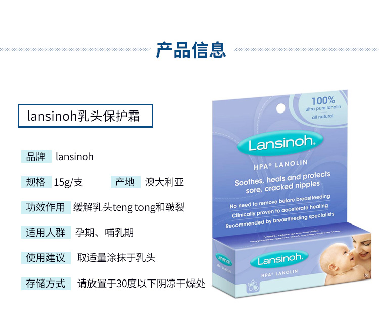 ️【准妈妈以及哺乳必备】️新生儿宝宝不会吸奶,咬得痛死乳头膏可以大大缓解疼痛,母乳前不用洗净喔,宝宝可以吃进去澳洲【Lansinoh乳头霜/羊脂膏乳头膏15克】澳洲医院推荐!针对产后母乳的妈妈们,特别适合刚开始喂母乳的妈妈们~乳头很容易被咬破、出血。这款乳头霜天然无副作用,在被咬破的乳头上一涂,立刻缓解疼痛,止血💕 【Lansinoh乳头霜/羊脂膏乳头膏15克】 (缓解母乳哺育而产生的乳头痛感和破裂)利用专利技术特别为哺乳开发。其对因母乳哺育而产生的乳头痛感、破裂能够起到效果。使用目前世界上纯度高的100%天然羊毛脂,它可以减缓皮肤自然水分的蒸发,为皮肤提供一道屏障使皮肤能够在其保护下自然水化滋润。同时对缓解痛感有立竿见影的效果。