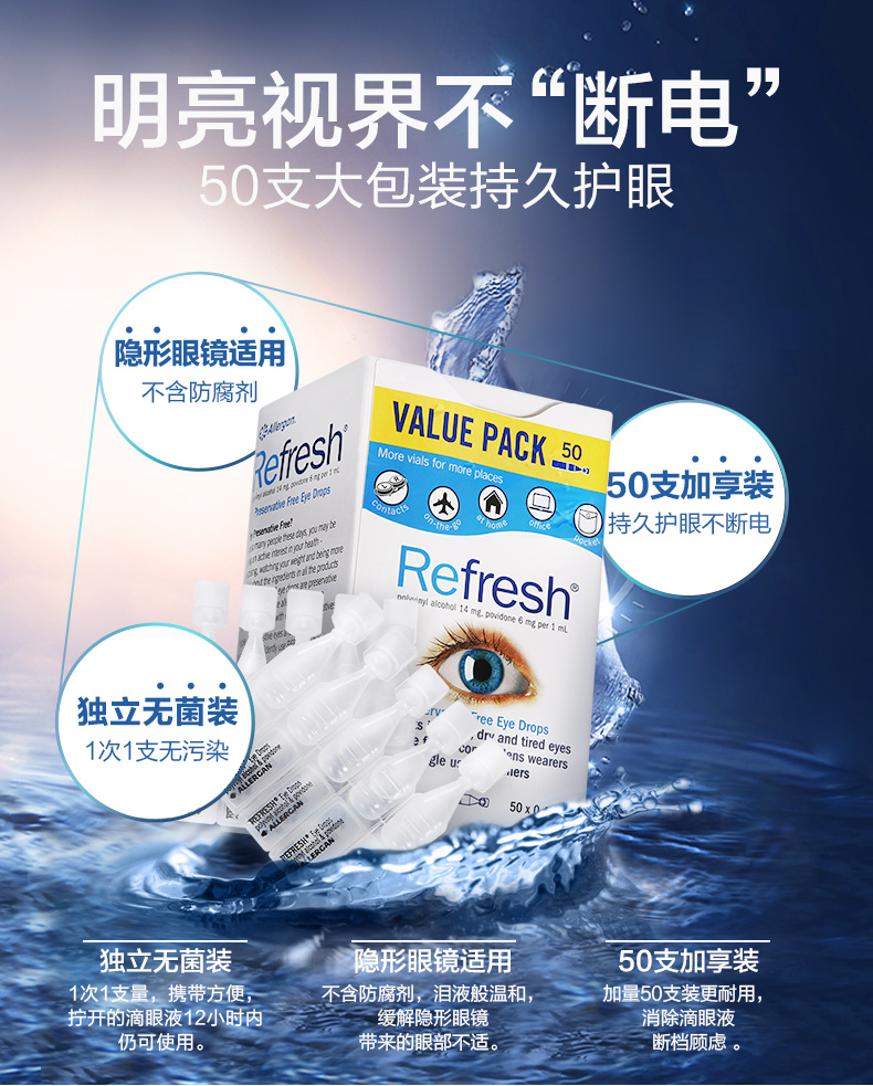 【Refresh眼药水】 🇦🇺50小支/盒升级版大包装(普通版是30支的),澳洲眼科👁️医生推荐给激光术后或者隐形眼镜佩戴者使用🏻⚕️它是市面上!!!唯一!!!不含防腐剂的滴眼液🌍上榜全球十大著名眼药水——适合抗疲劳上班族、佩戴隐形眼镜者、长期使用电脑/看书人群、空调房️工作的眼干人群。缓解疲劳,自用款️出街随身携带一小支,戴着隐形眼镜也可使用️因为不含防腐剂,所以独立小管在开封后需要在12个小时内用完,每管可以滴8滴左右~~!!