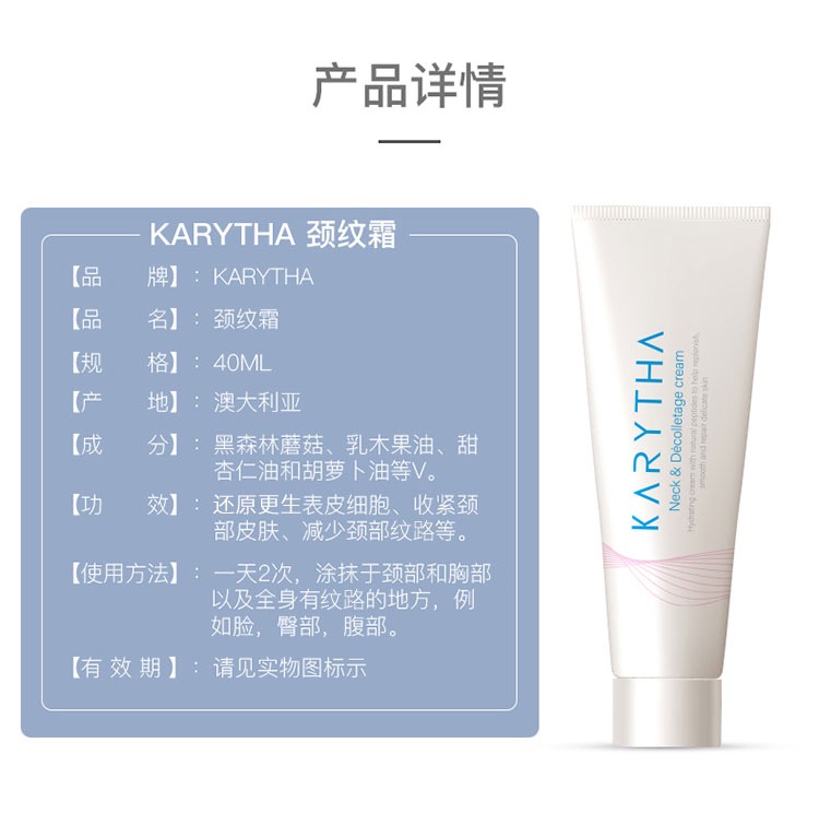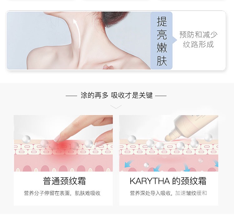 👉新品推荐【KARYTHA颈霜颈纹霜40毫升】 🦋100%好评的性价比最佳颈霜,蕴含珍贵ACTIFCOL™成分提取🧪自橡树黑蘑菇͏Shiitake、乳木果油🥑甜杏仁油天然成分,促进 胶原蛋白的合成并减少胶原蛋白的变͏质͏和流失,28天即可形成强韧胶原纤维网 轻松缓解预防皱纹🔆涂得再多,吸收才是关键💪 , 普通颈纹霜,营养分子停留在表面,肌肤难以吸收😔 ,Karytha颈纹霜✨ ,营养深处导入吸收,深入触达,激活胶原蛋白💗 ,淡化颈纹,紧致肌肤💕 ,不让颈纹出卖您的年龄❤ ~