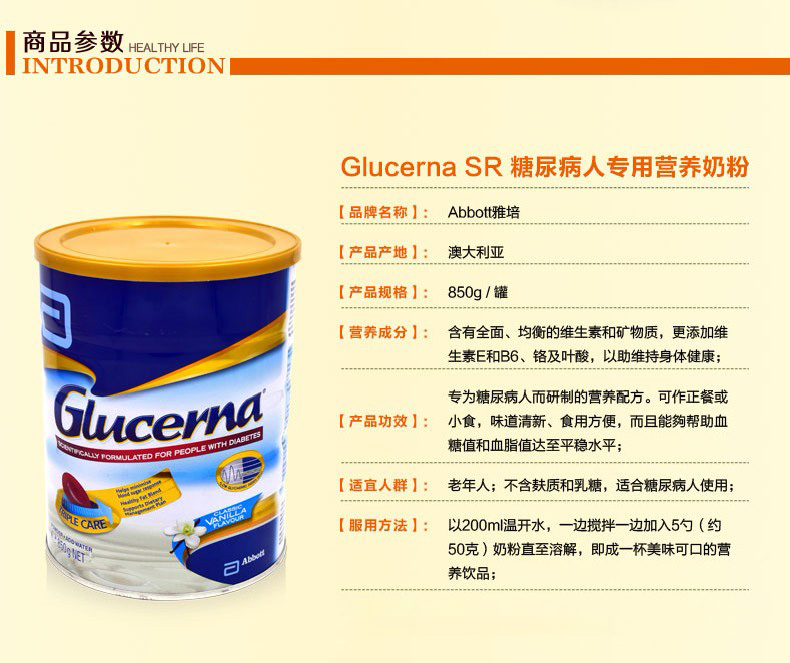雅培Glucerna无糖营养奶粉/糖尿病奶粉/高血糖专用营养粉850克老人、糖尿病、高血压、高糖血孕妇可以放心用食,专业配方不,含蔗糖、果糖,3倍防护,稳血定糖、营养均衡、将血压、胆固控醇制于目水标平(瓶身显的眼介绍),有效降餐低后血糖胰及岛素反应,帮保助持血浓糖度