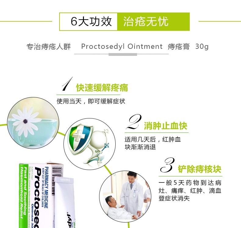 国内现货到了!下单秒发!直邮亦可!绝对成百上千销量的口碑产品【Proctosedyl痔疮膏30克(绿色包装)】! 有多安全?孕妇可完全放心使用!“十人九痔”️要想“大痔化小,小痔化了”就用澳洲🇦🇺的proctoesdyl痔疮膏Proctosedyl痔疮膏是药剂师首推的同类产品!改款痔疮膏可用于治疗顽强性内痔、外痔,肛门粘膜溃疡,肛裂,肛痒等症状,而且轻度和中度的均可根治,治疗同时消炎止痛杀菌,让人告别痔疮困扰!! 请认准绿色版本!蓝色版没有软膏尖嘴套件!非常不易使用!不推荐!