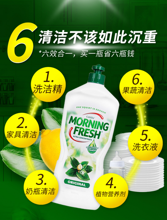 它是全球公认最最安全的洗洁精产品!澳洲连续30年销量第一的环保Morning Fresh洗洁精真是家家户户自用‼️1,2滴就能把一堆碗洗得干干净净奶瓶🍼蔬果🍑衣服玻璃都可以清洗!最最最重要的是️它安全环保无毒✅而且绝对不伤手即使不戴手套 洗完也不会干燥和紧绷感不夸张的说甩其他品牌几百条街‼️用过它会让你不再想其它牌子洗洁精!