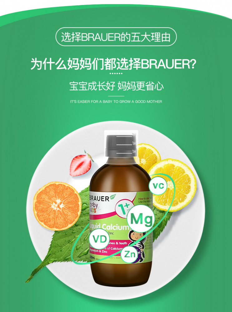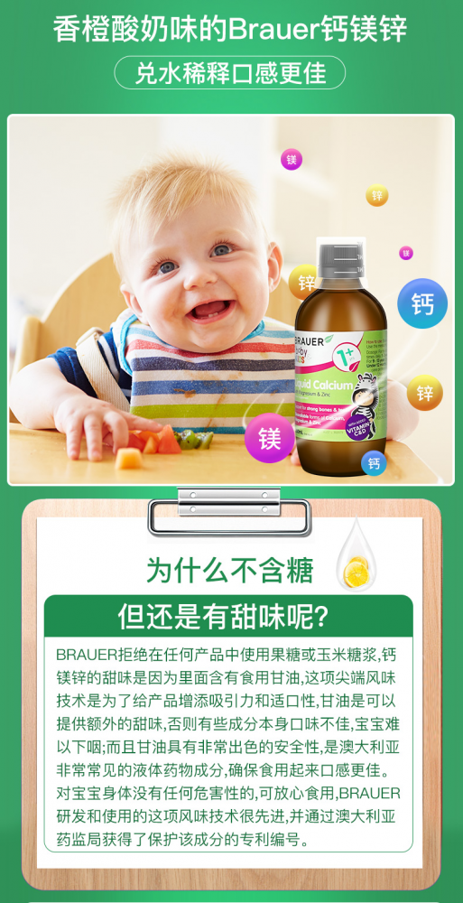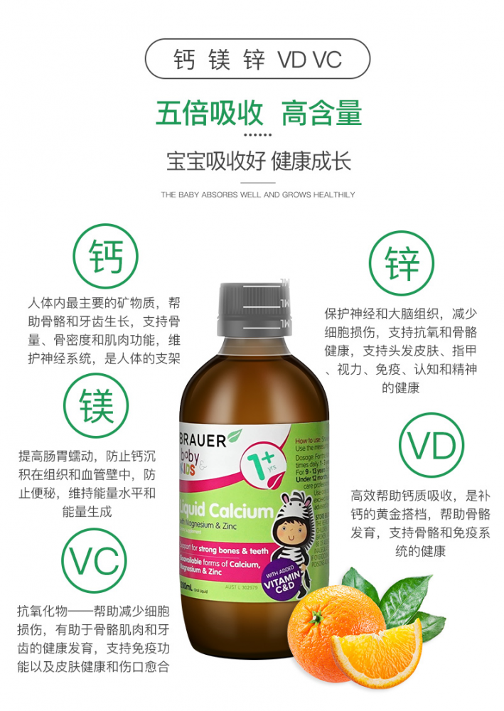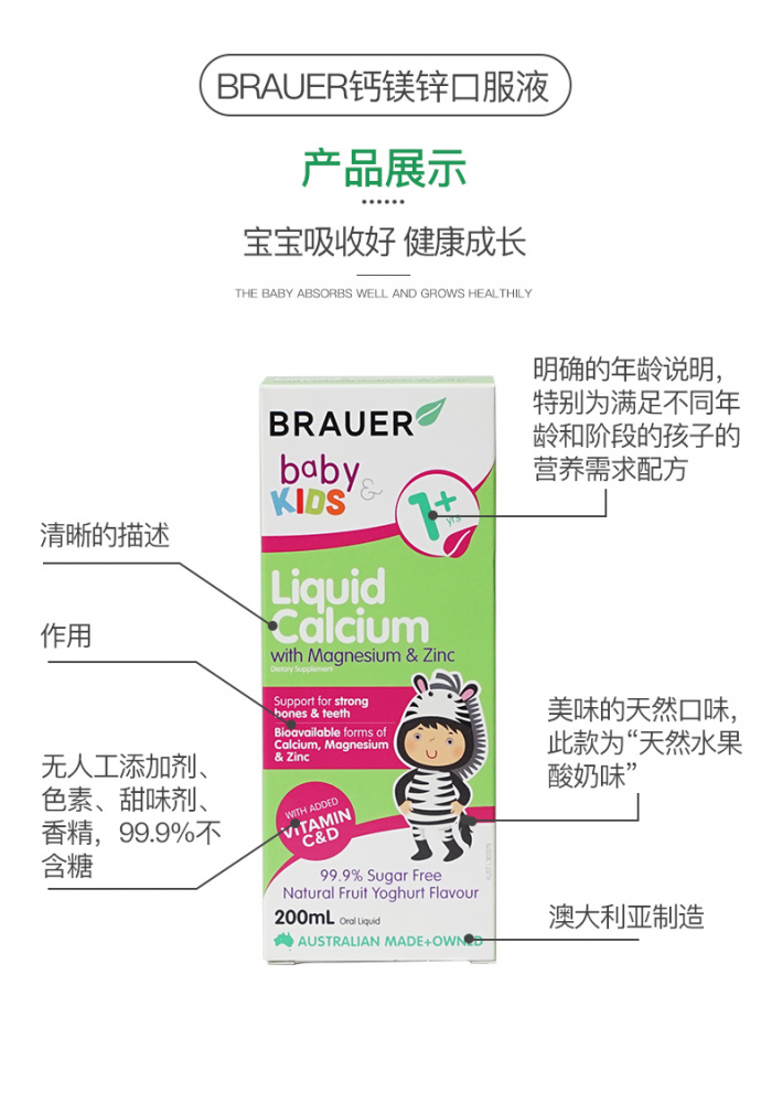 【Brauer蓓澳儿钙镁锌营养液/液体钙200毫升(水果酸奶口味)】 话说美国不是有童年时光钙镁锌液么,澳洲有Brauer!成立于更早的1929年,通过的是高于FDA(美国药品生产标准)的TGA(澳洲处方药生产标准)!! Brauer儿童液体锌的主要成分是甘氨酸锌,属于锌中贵族,是最好吸收的锌。 里面的微囊化钙,是吸收率最高的钙种类,特别添加VC和VD帮助吸收! 不含糖!!!无额外添加!!小泡芙同款,李佳琦竟然也推荐过。。。。