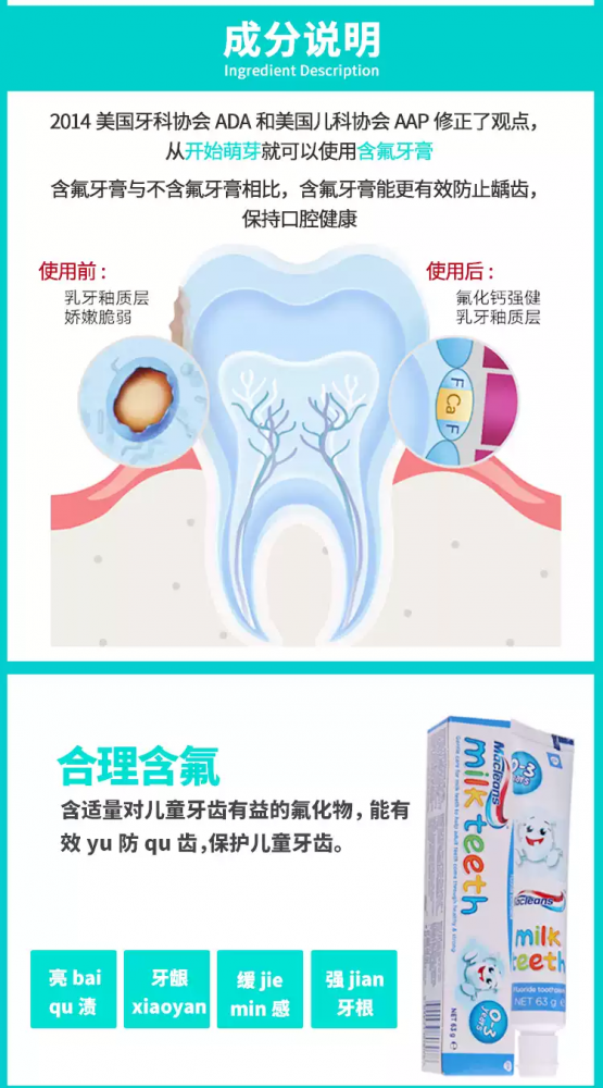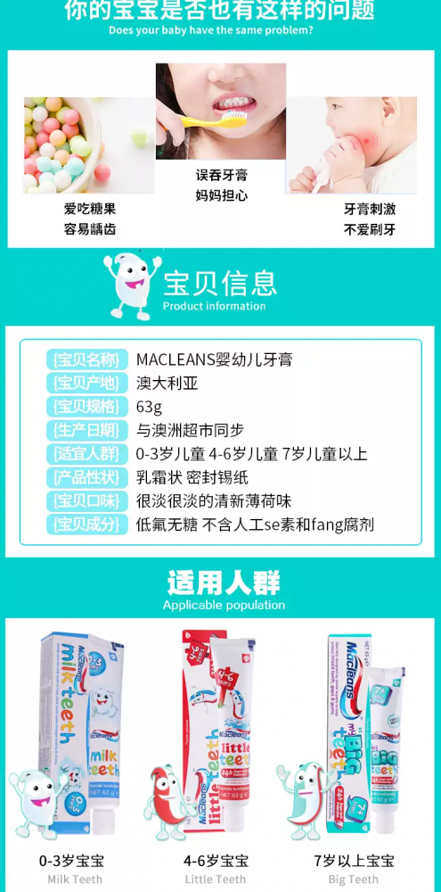 国内现货已到!最新保质期!直邮亦可!下单秒发!【Macleans低氟可吞咽儿童牙膏】0-3岁、4-6岁、7岁以上三种可选!性价比超高! Macleans是澳洲、英国、新西兰销量最高的儿童牙膏产品,全部通过各类牙医协会的认可!澳洲牙科医生推荐的可吞咽的儿童牙膏分为3个阶段:蓝色0-3岁,红色4-6岁,绿色7岁以上。刚出生就可以放心使用了,专为婴幼儿设计的牙膏,可有效保护乳牙的珐琅质、防止蛀牙,低氟化物、可吞咽、不含糖、不含人造色素,不含防腐剂。 在为宝宝愉快放心刷牙的同时,更重要的是养成宝宝们习惯刷牙的好习惯!