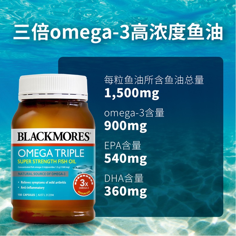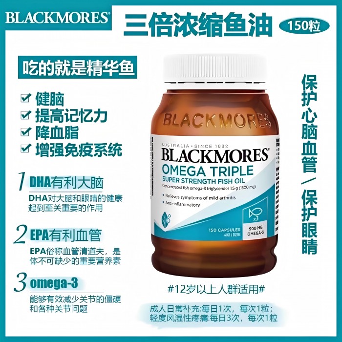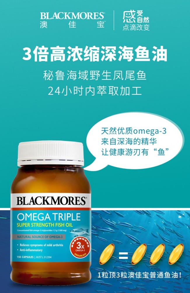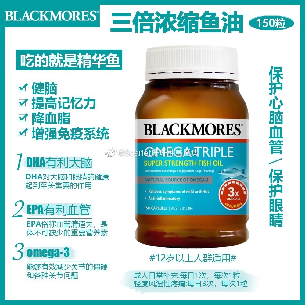 嫌普通的鱼油颗粒大?含量低?鱼腥味重?那就选择这款Blackmores三倍浓缩深海鱼油💫! 原料纯净,富含高浓度Omega3,1粒=普通鱼油3粒,保护心脏和大脑,改善长期用眼疲劳,增强免疫系统,降血脂血糖,养护磨损关节。 仅需每日服用1粒就有显著效果,不仅无鱼腥气,容易吞咽,更有香草好口味!!