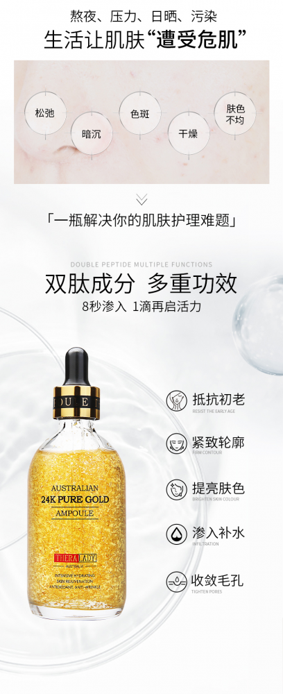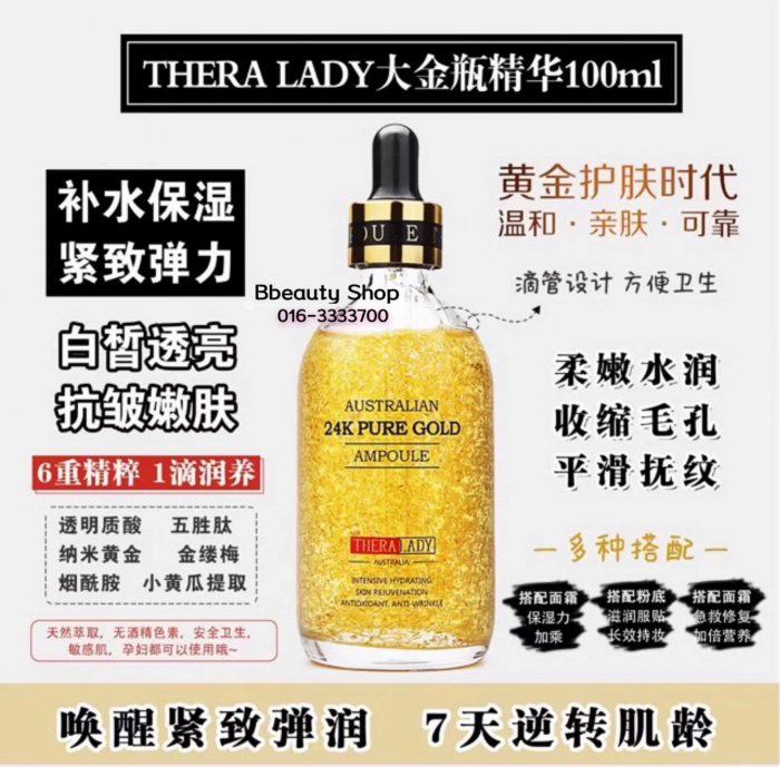 火爆澳洲的大金瓶,全名叫做Thera Lady贵妇24K黄金精华100ml,说下这澳洲大金瓶的几大特点:1️⃣保湿效果很棒,很滋润!2️⃣抗皱效果很明显,20岁之后就可以用!含有黄金因子,保湿效果提升!亮白淡斑。3️⃣加入五胜肽,皮肤更有弹力!吸收很快!4️⃣孕妇,敏感肌都可以用哦!澳洲黄金做成的可溶性纳米级黄金哦!|新版 澳洲24k大金瓶把黄金加入护肤品中,当黄金接触到肌肤会释放出有益离子,能快速互动并渗透至肌肤深层促进新陈代谢~延缓胶原蛋白及弹力蛋白分解同时将护肤成分导入基底层,激活底层细胞修复更满满一大瓶24K可溶性纳米级黄金精华液,Thera Lady 实验室良心出品~让您的美如黄金般恒古不变~|Thera Lady家的澳洲大金瓶, 纳米黄金配以透明质酸、烟酰胺、五胜肽、金缕梅小黄瓜提取物,8秒渗透、1滴焕肤,不仅颜值担当,集美白抗皱保湿淡斑于一身,融入24k纳米黄金的精华液,加强了营养物质的导入,功效翻倍!富含纯净的黄金离子去除引发肌肤老化的重金属及各种有害物质,同时彻底清除毛孔中的代谢废弃物,赋予肌肤前所未有的健康与活力~ 排毒养颜非同一般!|澳洲直邮 澳洲大金瓶,补水、保湿、提亮,用了就有效果 6000年黄金护肤术与澳洲黄金的完美邂逅, 选用来自珀斯的高纯度24K纳米黄金,几秒钟就完美吸收,8秒渗透, 高浓度玻尿酸、烟酰胺、五胜肽,金缕梅配方, 每瓶都是澳洲Thera Lady 贵妇实验室的杰作,每个贵妇必选精华液。100ml大金瓶,早晚一分钟水润滋养,抗衰老。必须入手的精华液
