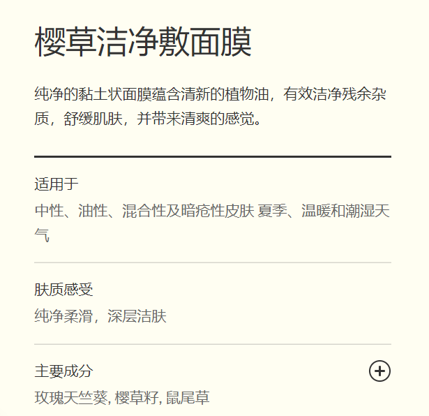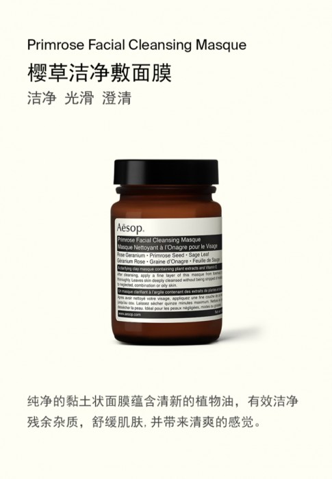 【Aesop伊索】系列里最好的面膜产品樱草洁净敷面膜/樱草面膜120毫升 女人我最大强烈推荐,美丽教主伊能静的最爱.这是Aesop最具人气,也是最受赞赏的产品。 主要成份:晚櫻草.玫瑰天竺葵.鼠尾草 适用范围:所有肌肤 以优质法国黏土为基底,蕴含维他命E及多种能柔软肌肤的抗氧化活性植物精华。替皮肤作深层清洁,而不会令皮肤变得干燥。用后肤色清透均匀,并能淡化瑕疵。 萃取自缨草及玫瑰籽的精华,含天然维他命E及C与丰富的gamma-亚麻油酸,快速吸收,充分滋润肌肤,并且柔软与舒缓肌肤。怡人的植物芳香深受使用者喜爱。 使用方法:建议您一周使用一次, 是清除毛细孔污垢及阻塞的最佳产品,油性肤质可视状况增加使用次数。请搭配纯净滋润洁面乳或焕采柔舒洁面露使用。