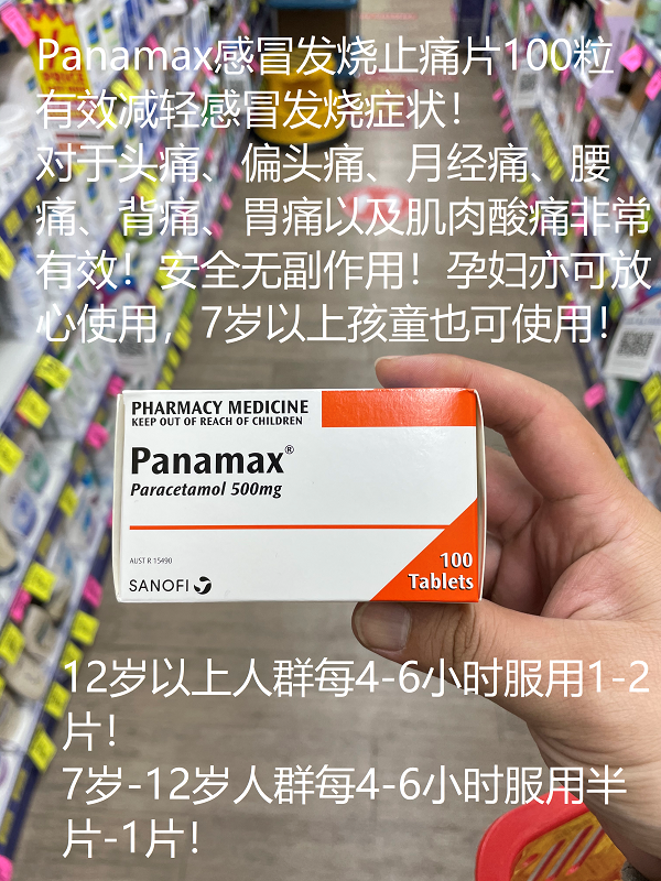 感冒发烧不要随便使用抗生素已成共识!这款100粒大盒装的Panamax会极其有效地减轻你感冒发烧的症状,而且对于头痛、偏头痛、月经痛、腰痛、背痛、胃痛以及肌肉酸痛亦非常有效!安全绝无副作用!7岁以上孩童以及孕妇均可放心使用!家中常备,基本澳洲家庭医生90%会针对你的症状推荐这款产品! 12岁以上人群每4-6小时服用1-2片,7-12岁的孩童每4-6小时服用半片-1片!