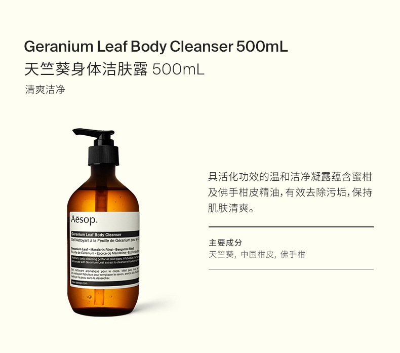 安利一款巨好用的沐浴露洁肤露【Aesop伊索天竺葵身体洁肤露/沐浴露500毫升】 伊索也有同款的天竺葵身体乳提振精神的身体清洁产品,味道特别高级适合各种肤质。 天竺葵叶的萃取精华,能振奋精神,清洁和除臭。 温和低泡沫的清洁液洗后滋润不干涩。平常还可当洗手乳用。天竺葵叶的萃取精华能清洁和除臭,洗后滋润不干涩。