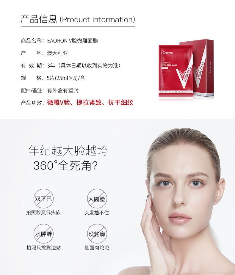 【Eaoron抗衰老提拉紧致修复微雕V脸补水保湿淡化细纹面膜5片/盒】 澳洲Eaoron V脸微雕面膜五片,微雕加冻龄! 从U到V,让你的每个角度都很美 EAORON全新微雕面膜,微压膜布,提拉瘦脸,改善浮肿。保湿+瘦脸双管齐下。抚平细纹,塑造青春容颜💖 💖 💖
