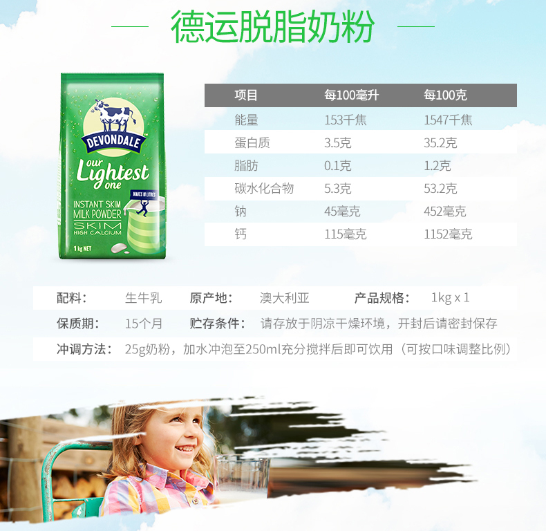 (西安现货)Devondale德运脱脂高钙奶粉(最新保质期)(国内段运费另算)