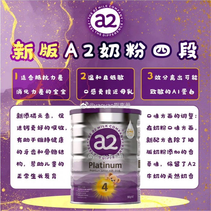 A2婴幼儿配方奶粉唯一一个含100%天然A2 β-酪蛋白的婴儿奶粉~很容易被宝宝消化吸收;每个段数根据不同年龄的宝宝调整配比,认准澳新版本才是最拥有最纯正奶源~温和低敏,适合消化力差抵抗力差的宝宝~