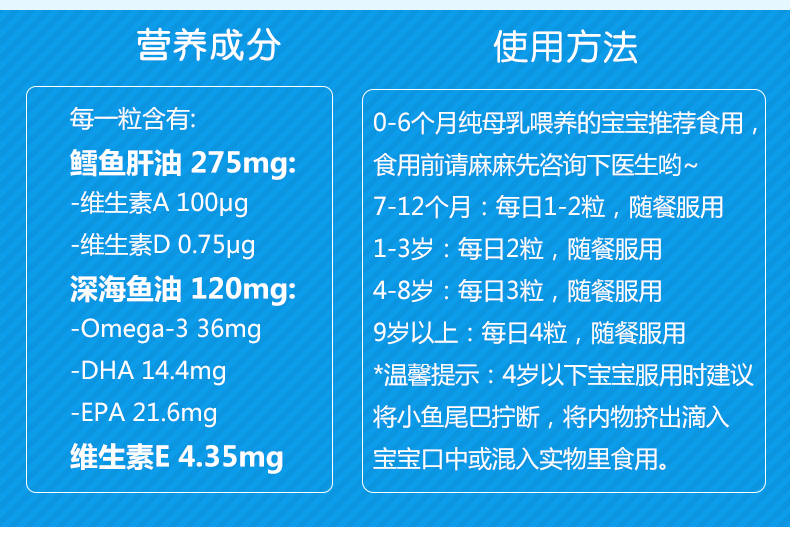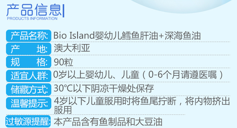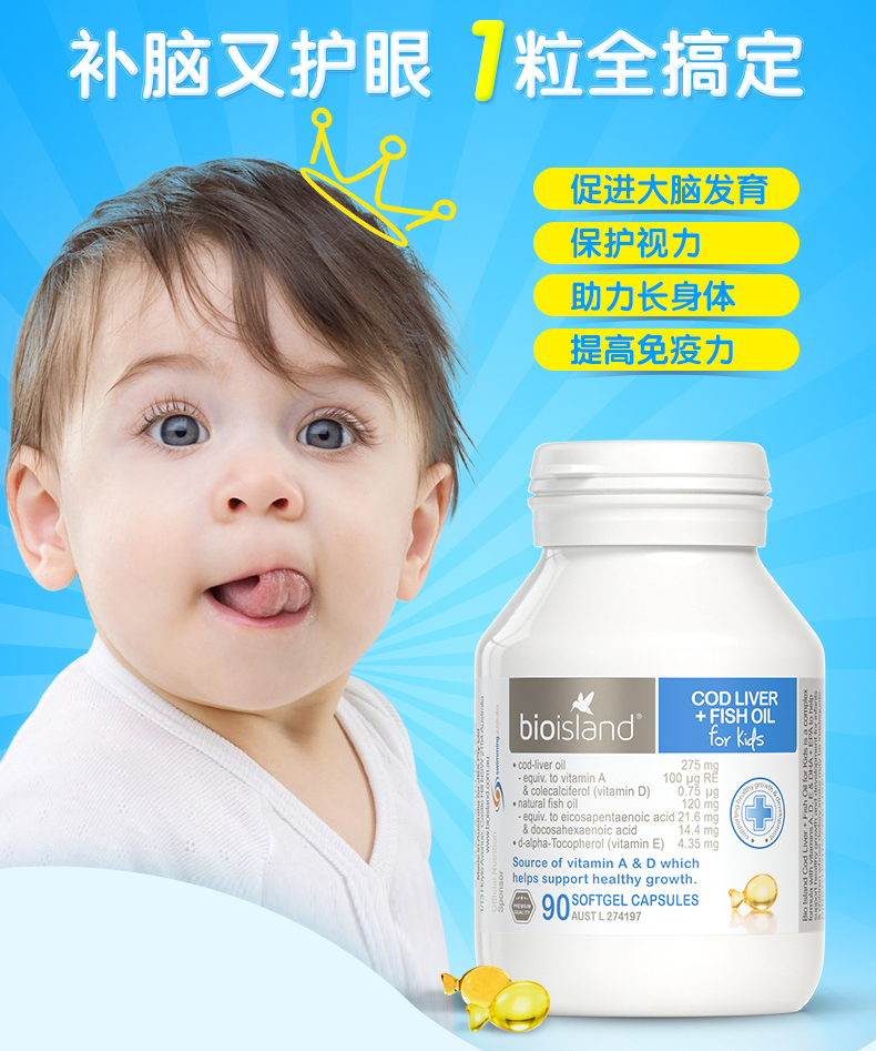 【Bio Island生物岛儿童鱼油/婴幼儿鳕鱼肝+鱼油90粒】顶级的婴幼儿营养品来自低极深海鱼,安全污无然天染🏻,提供然天的维命他A、D、E补充发育过中程所需的DHA和EPA,兼具鱼油和作的油肝鱼用!对脑部,眼康健睛发育起重要作用,4周以后的就可以用使,没有上限年龄,成人包括孕妇亦可使用。 使用方法: 28天-1岁婴儿每日1粒; 1—2岁幼儿每日2粒; 2—4岁儿童每日3粒; 5—9岁儿童每日3—4粒; 超过9岁青少年和成人需要4-6粒; 2岁以下的宝宝服用,应该把胶囊的尾巴拧开,把里边的液体挤到宝宝嘴里或者添加到食物中。