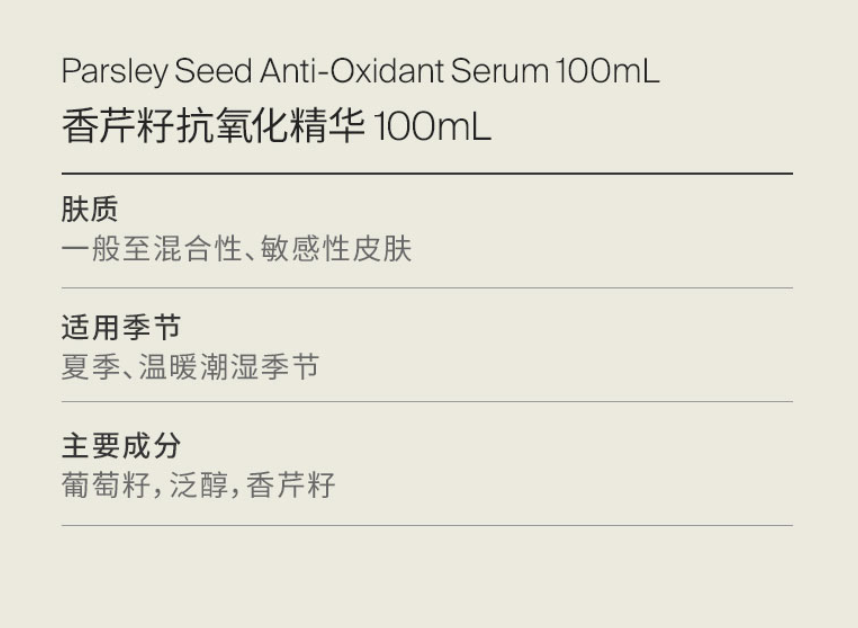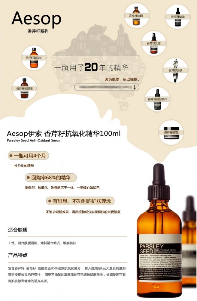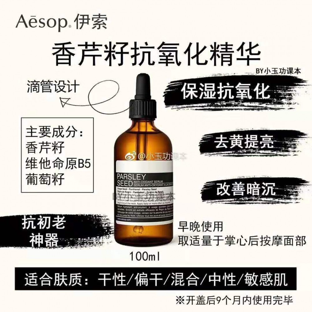 Aesop伊索毫无疑问是澳洲本土最高端最受欢迎的药妆品牌!【Aesop伊索香芹籽抗氧化精华100毫升】更是享有盛誉的头牌产品!它的效果从未遭受质疑,过去几年几乎每周都会有人主动来购,其纯天然、无添加的口碑,正在受到越来越多美容达人们的喜爱和追捧。这瓶香芹籽精华蕴含强效抗氧化成分的完美保湿精华,含优质且抗氧化效果优良的葡萄籽与香芹籽,并且加入维他命E及具滋润及镇定安抚效果的芦荟汁,适合每天使用,清爽的凝露质地专为不喜爱保湿乳液的人士而设,为干性、混合性及敏感性肌肤提供完美的保湿效果,极力推荐长期使用! 【Aesop伊索香芹籽抗氧化精华100ml】超强保湿和抗氧化。坚持使用下来对肤色提亮和稳定都有非常好的效果,抗氧化效果虽然来的慢,💧但最快最明显的感受是一天下来肤色不会暗沉。 而且对于有红血丝的皮肤也可以有改善的效果。适合敏感性皮肤,孕妇可用️