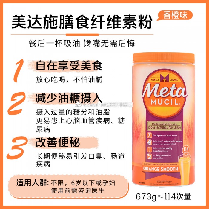 张韶涵推荐的纤维粉推荐下~ 【 爆款驾到】【Metamucil美达施香橙膳食纤维粉114次673克】一桶能喝114次哦,橙子味【 花儿与少年同款 】 明星餐后去油腻小秘诀 ——现在的生活大家吃的越来越精细,摄入的纤维越来越少。 Meta-Mucil 100%纯天然膳食纤维粉 通便排毒保健, 儿童到成人均可服用的一款! 预防肝癌和大肠癌;增加饱腹感,调整体重,降低胆固醇预防心脑血管疾病,延缓血糖上升,预防糖尿病。促进肠蠕动。每天两杯,改善便秘和排毒 。孕妇都可以食用