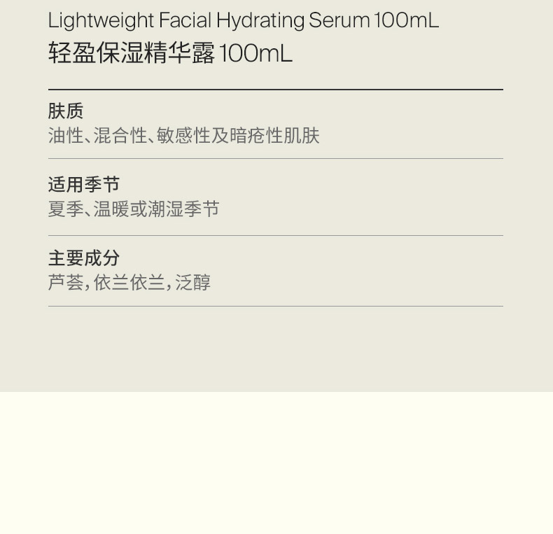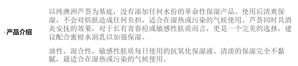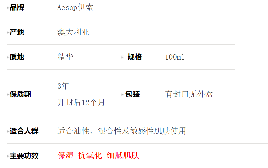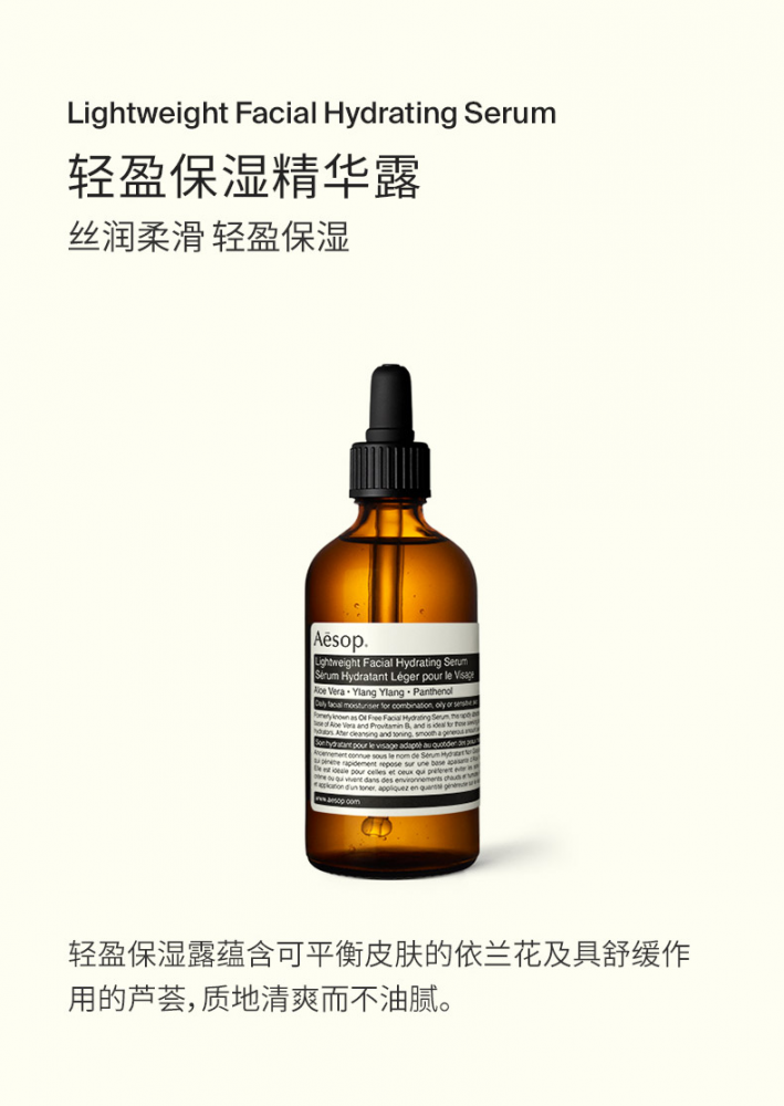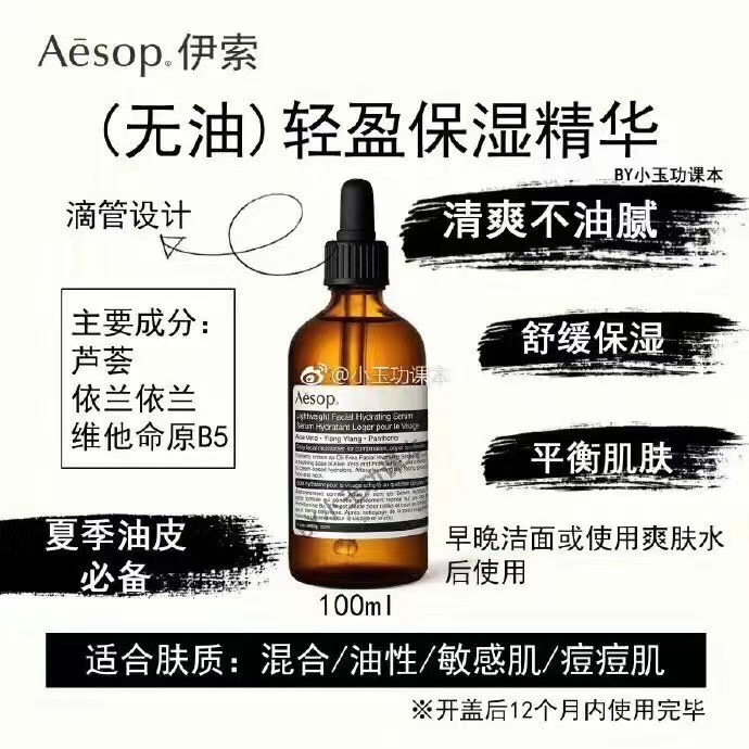 国内现货已到哈!下单秒发!直邮亦可!【Aesop伊索无油轻盈保湿精华露100毫升】(自用款!)以具镇定效果的芦荟为基质,更加入了维他命B及维他命C,为一款迅速吸收的高效保湿精华。芦荟同时具有消炎安抚的效果,对於长青春痘与敏感肤质更是一个完美的保湿产品!以纯澳洲芦荟为基质的革命性保湿产品,是对保湿面霜感觉仍不够清爽的您绝佳的选择。使用后清爽保湿无负担,适合在湿热或污染的气候使用。芦荟同时具有消炎安抚的效果,对于长青春痘与敏感肤质更是一个完美的保湿产品!自用款评价:质地非常清爽!超级好吸收的精华液!